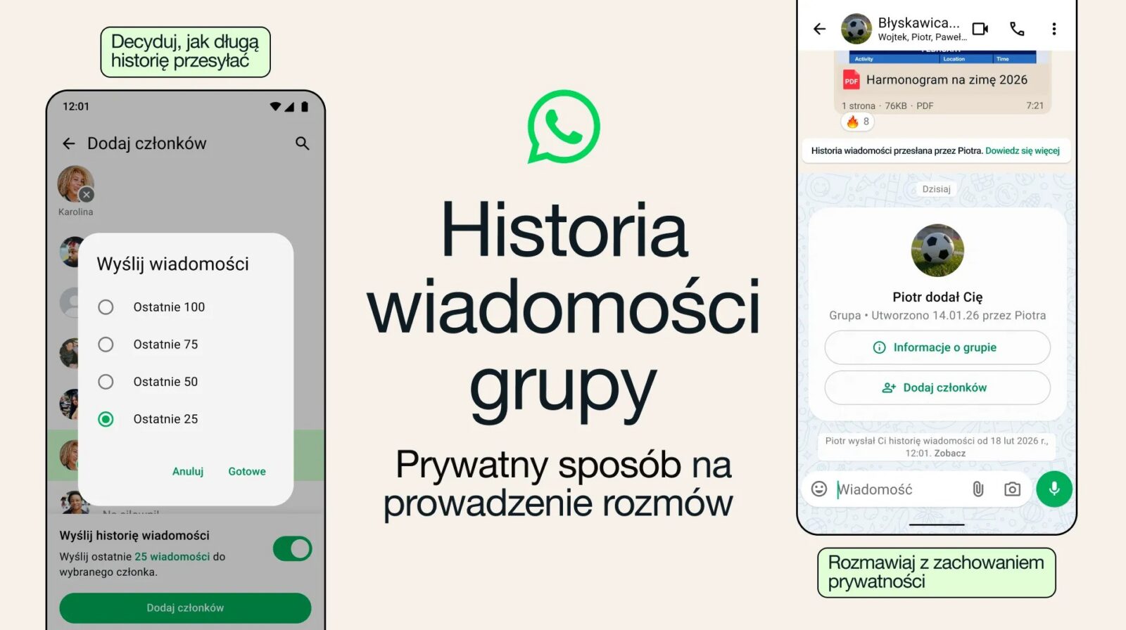 Co ważne dla zwolenników prywatności, cała ta operacja odbywa się z zachowaniem pełnego szyfrowania end-to-end. Oznacza to, że nikt poza uczestnikami grupy – nawet sam WhatsApp – nie ma wglądu w przesyłaną historię. Funkcja ta ma być znacznie bezpieczniejszą alternatywą dla ręcznego przekazywania wiadomości czy robienia screenów, co często bywało jedynym sposobem na wprowadzenie kogoś w temat.