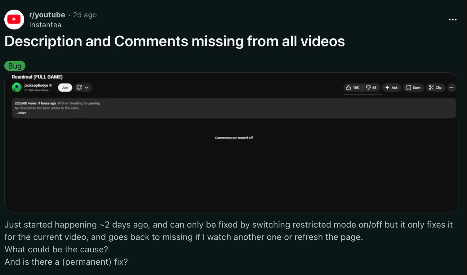 W ostatnich dniach fora internetowe, w tym popularny subreddit poświęcony YouTube, zalała fala skarg od użytkowników, którzy zauważyli dziwne zachowanie platformy. Problem polega na wyświetlaniu komunikatu „Komentarze są wyłączone” pod niemal każdym oglądanym filmem, niezależnie od tego, czy twórca faktycznie je zablokował, czy nie. Szybko okazało się, że usterka – o ile można to tak nazwać – znika natychmiast po wyłączeniu wtyczki blokującej reklamy lub zmianie przeglądarki na taką, która nie posiada wbudowanych mechanizmów antytrackingowych.