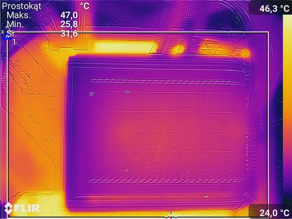 Testy przeprowadziłem przy wykorzystaniu wielowątkowego testu Cinebench 2024, który działał 10 minut. Poniżej możecie zobaczyć zdjęcia termowizyjne wykonane dzięki smartfonowi CAT S61.