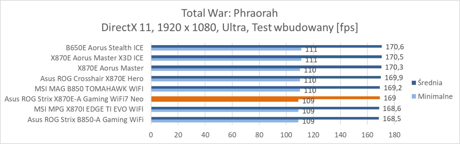 Na koniec przeprowadziłem testy w trzech grach: Total War: Phraorah, Assassin’s Creed Mirage oraz Far Cry 6. Testy wykonałem w rozdzielczości 1920 x 1080 px przy najwyższych ustawieniach. Wyłączyłem tylko ray tracing oraz DLSS/FSR, jeśli dana gra miała takie opcje. Testy przeprowadziłem przy wykorzystaniu wbudowanych w gry benchmarków. W przypadku Total War był to benchmark battle.