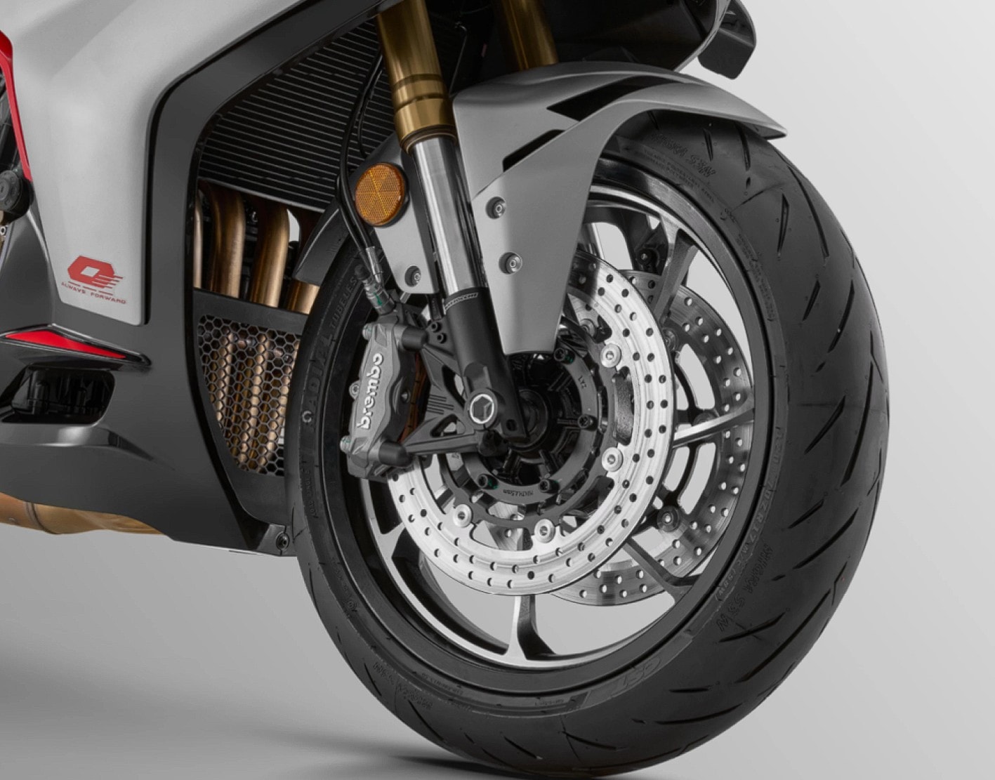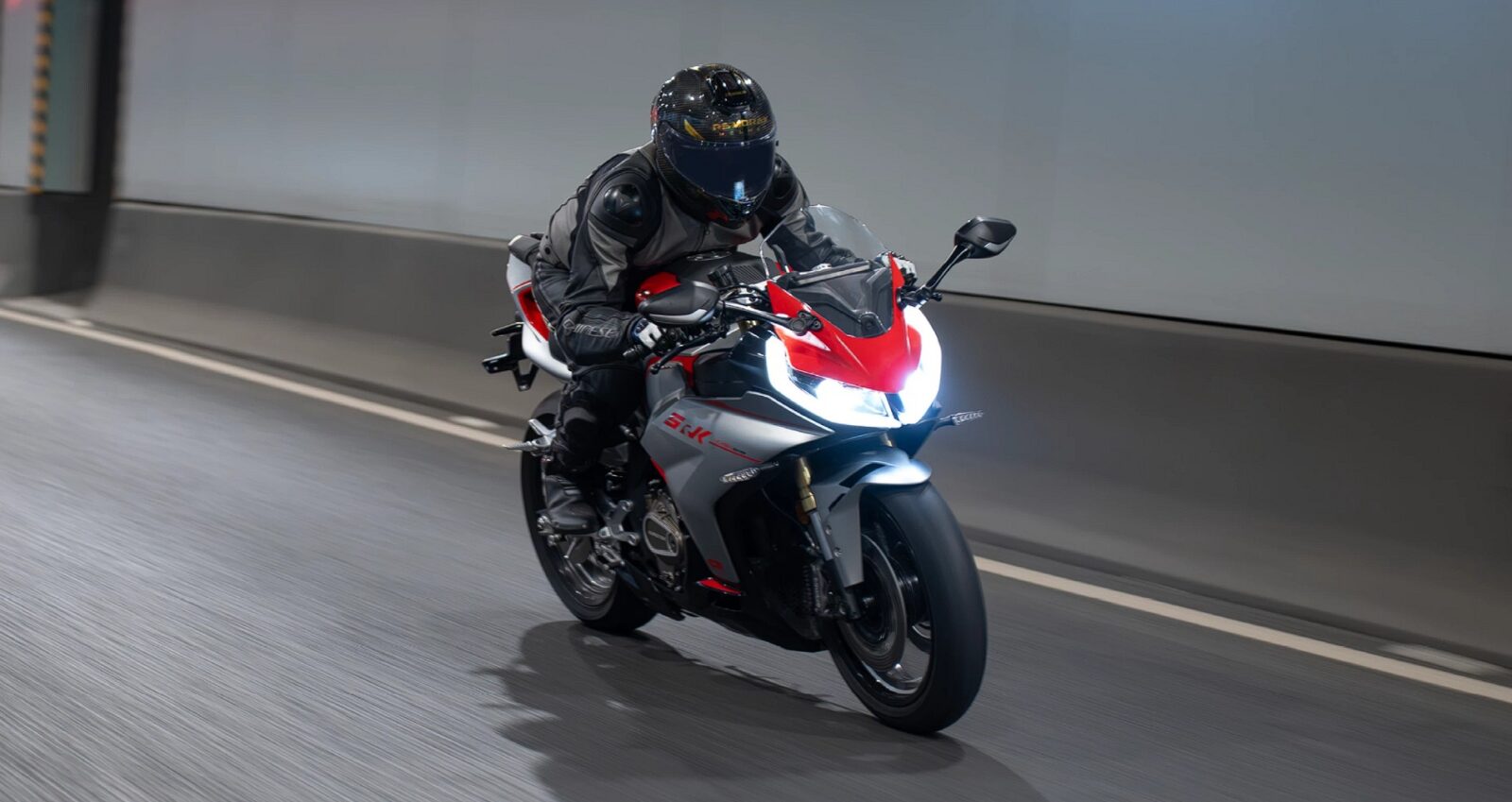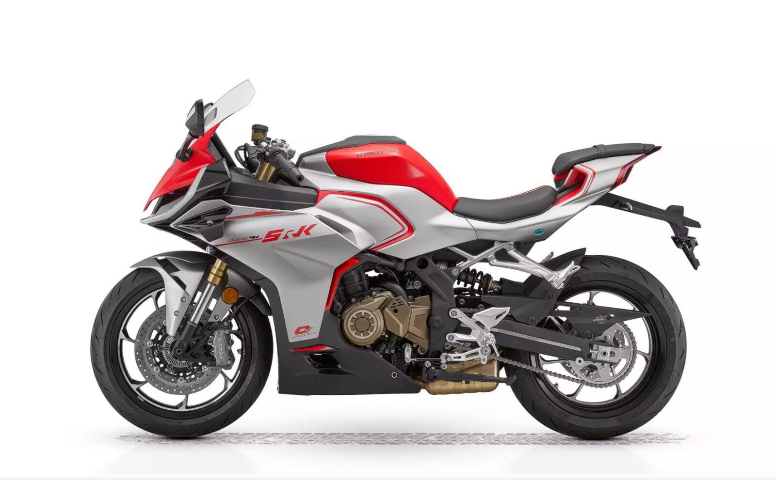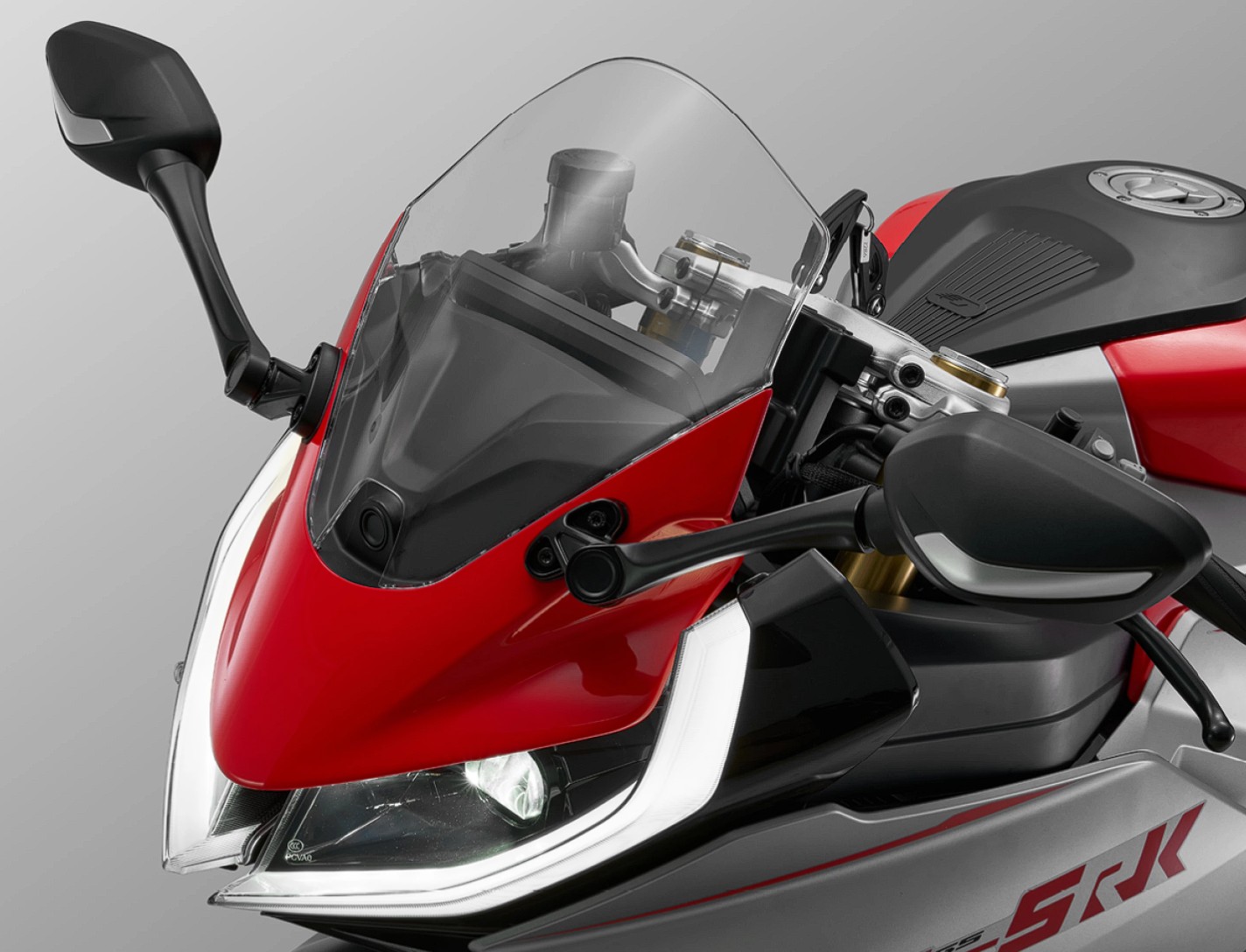 SRK 421 RR wygląda jak motocykl, który nie wstydzi się kosztownych nazw. Znajdziemy w nim bowiem widelec USD z pełną regulacją, tylny układ wielowahaczowy z amortyzatorem Marzocchi, a do tego hamulce Brembo, które obejmują z przodu dwie tarcze 300 mm z radialnymi, czterotłoczkowymi zaciskami, a z tyłu pojedynczą tarczę 240 mm. Do tego dochodzi ABS i kontrola trakcji, a nawet elektronika. Skromna, ale sensowna, bo obejmująca dwa tryby jazdy (Normal i Sport), które wpływają na reakcję przepustnicy i poziom ingerencji systemów wsparcia. Do tego dochodzi 7-calowy ekran TFT z łącznością ze smartfonem i funkcją mirroringu nawigacji, a także TPMS i ładowanie USB w postaci dwóch portów o mocy 18 W z dwoma portami.