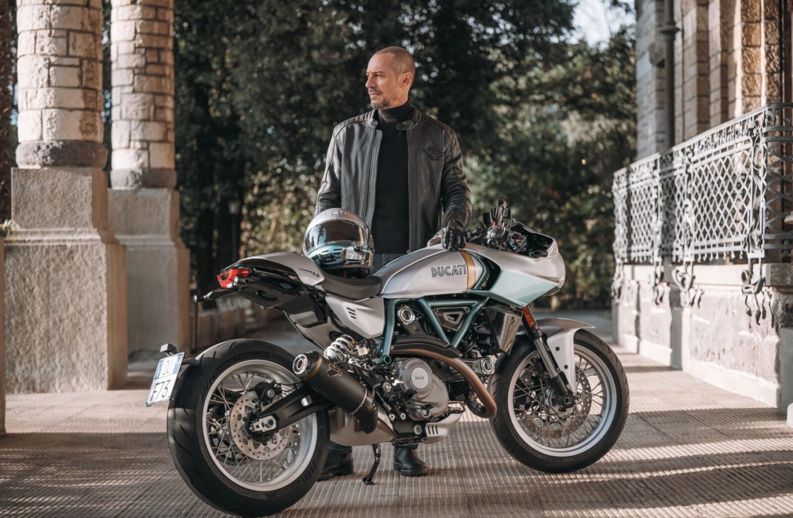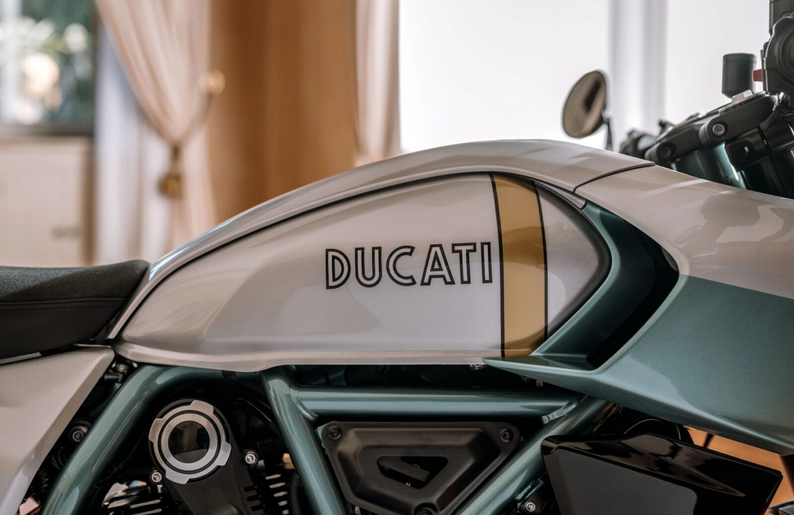 Formula 73 to próba uchwycenia ducha tamtych czasów we współczesnym opakowaniu. Stylistyka café racer jest czytelna, bo widać ją w niskiej kierownicy clip-on, lusterkach bar-end i minimalistycznej owiewce. Charakterystyczną kolorystykę odtworzono zaś z drobiazgową precyzją, korzystając z archiwów Ducati Style Centre. Ciekawym detalem jest pionowy złoty pasek na zbiorniku, będący bezpośrednim nawiązaniem do oryginału, gdzie pełnił funkcję wskaźnika poziomu paliwa. Wrażenie dopełniają liczne elementy z aluminium, takie jak dźwignie czy korek paliwa od Rizomy, a do tego rama kratownicowa pomalowana na kolor zielony (dokładnie aqua green).