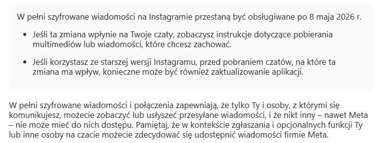 Od 9 maja ta bariera znika. Choć wiadomości nadal będą chronione podczas przesyłania (standardowe szyfrowanie w drodze), to po dotarciu na serwery Instagrama będą one technicznie dostępne dla systemów firmy. To nie tylko kwestia algorytmów reklamowych czy moderacji treści. Brak E2EE oznacza również, że w przypadku oficjalnych zapytań ze strony organów ścigania czy rządów, Meta będzie mogła udostępnić treść rozmów, których wcześniej nie była w stanie odczytać.