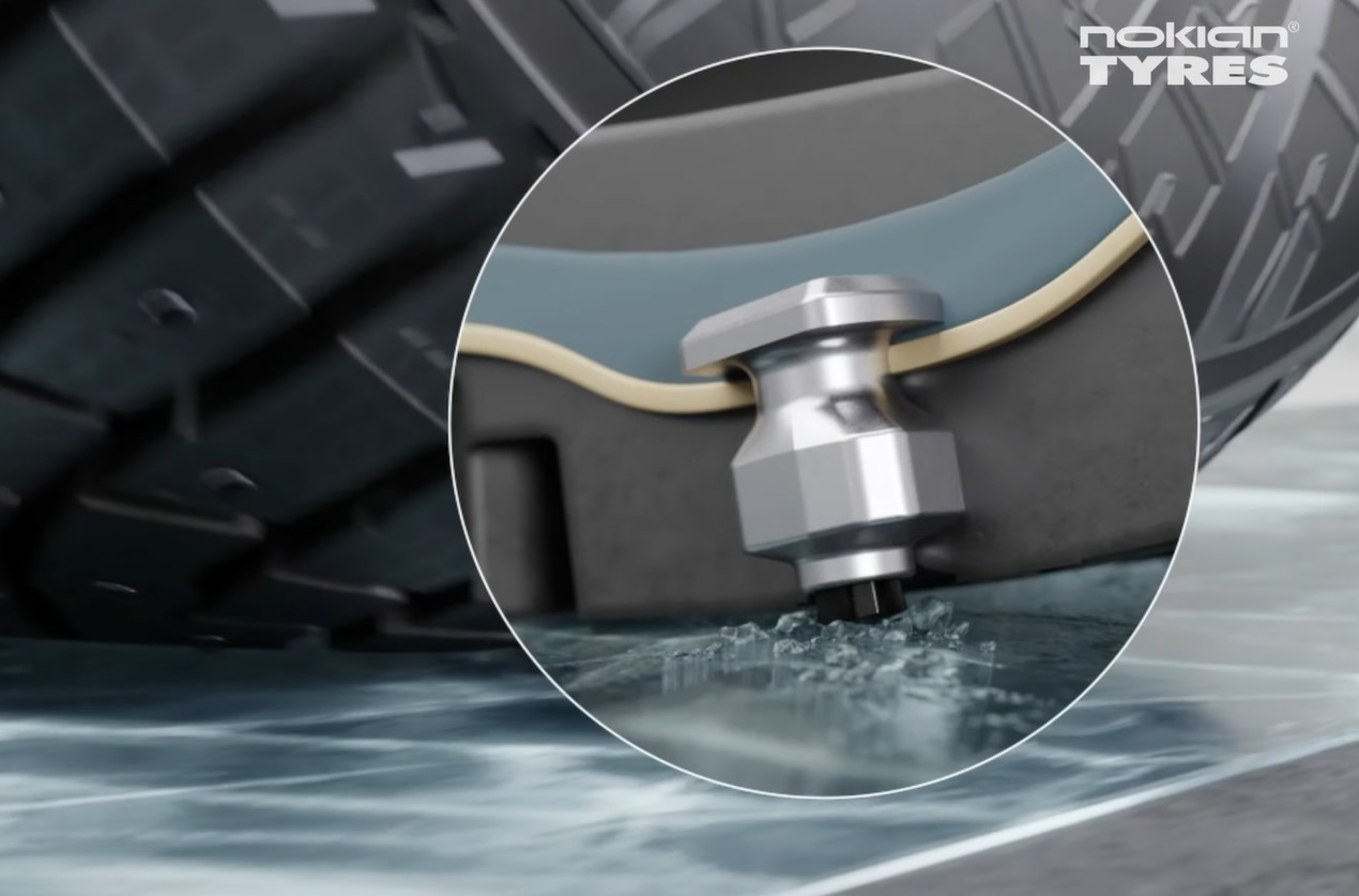 Specjaliści firmy Nokian zamiast stawiać na technologiczne wymysły czy mechanikę, postawili na sterowanie bezpośrednio samą gumą. W oponie zastosowali bowiem wielowarstwową konstrukcję, w której dolna warstwa bazowa twardnieje na mrozie, wypychając około 220 precyzyjnie ułożonych kolców z węglikiem wolframu bliżej powierzchni bieżnika. Przy wyższych temperaturach opona z kolei mięknie, pozwalając kolcowi schować się głębiej. W tym wszystkim działa również warstwa kotwicząca rzędu około 1 mm, która ma kontrolować pracę całego układu.