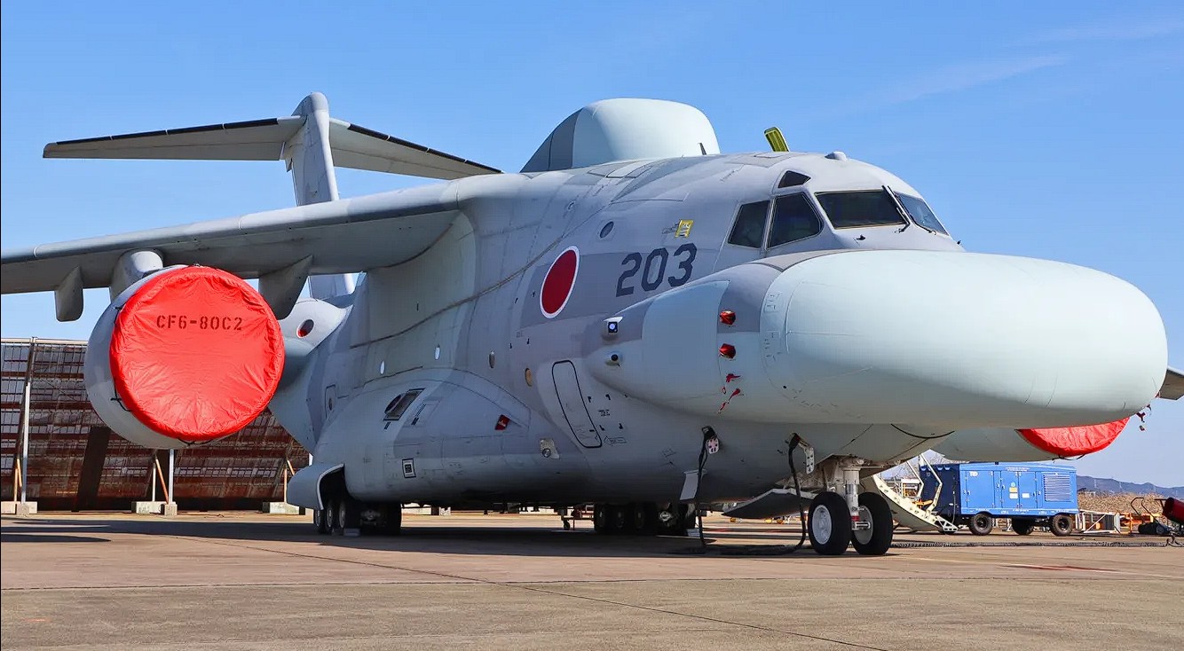 Japonia nie budowała EC-2 od zera. Maszyna powstała na bazie rodzimego transportowca Kawasaki C-2, który ma 43,9 metra długości, masę startową na poziomie około 141 ton, a podczas lotu osiąga prędkość około Mach 0,82 i może zabrać na pokład do 36 ton ładunku. To już nie jest mała platforma do niszowych zadań, ale duży odrzutowy samolot zdolny udźwignąć ciężki zestaw elektroniki, zasilania, systemów samoobrony i obsługi misji.
