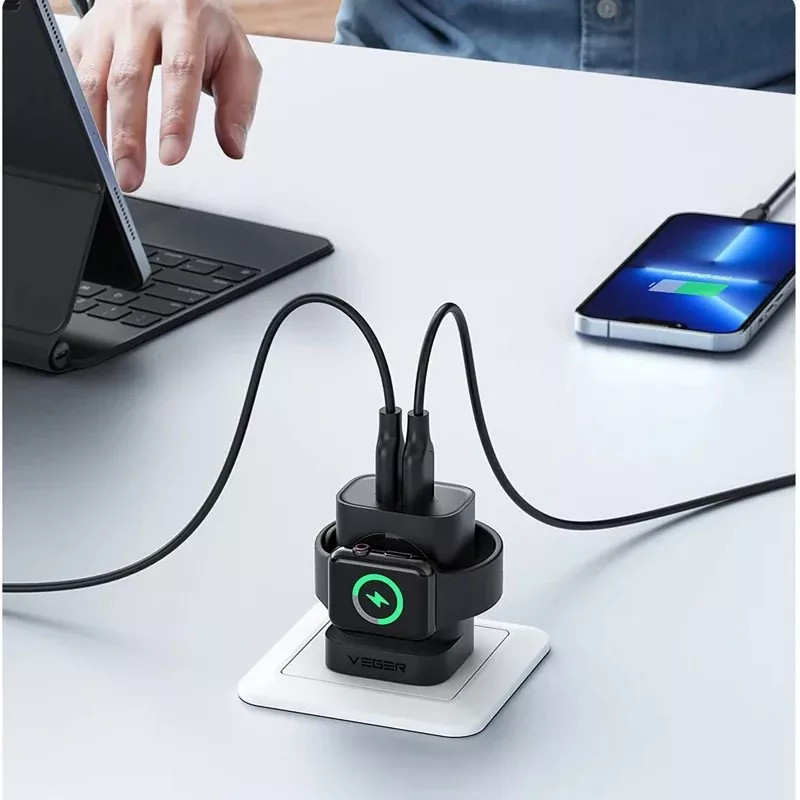 Model Veger W002E został pomyślany właśnie w ten sposób. Ma dwa porty przewodowe, USB-C i USB-A, a dodatkowo wbudowany moduł ładowania kompatybilny z Apple Watch. To pozwala ładować jednocześnie trzy urządzenia, więc jeden punkt przy gniazdku może obsłużyć cały najczęściej używany zestaw: telefon, zegarek i na przykład słuchawki. Mniej przepinania, mniej kostek, więcej porządku.
