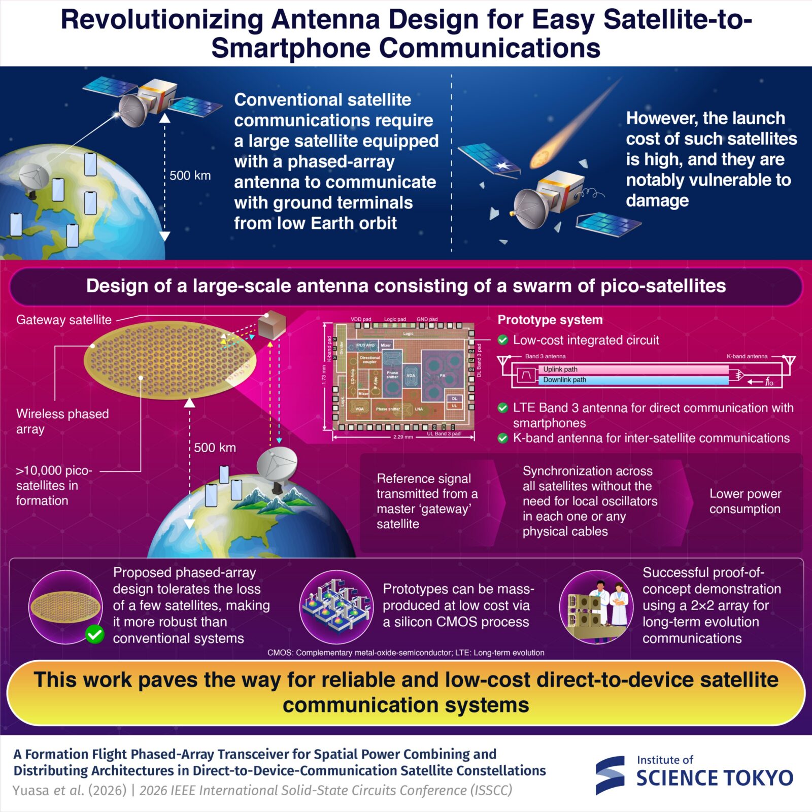Zespół pod kierownictwem profesora Atsushiego Shirane zaproponował zupełnie inne podejście, które zaprezentowano podczas konferencji ISSCC w lutym 2026 roku. Zamiast jednej wielkiej anteny połączonej kablami, naukowcy stworzyli system, w którym każdy element anteny znajduje się na osobnym piko-satelicie. Największym wyzwaniem była synchronizacja – jak sprawić, by tysiące niezależnych obiektów w kosmosie działało jak jeden organizm bez fizycznego połączenia?