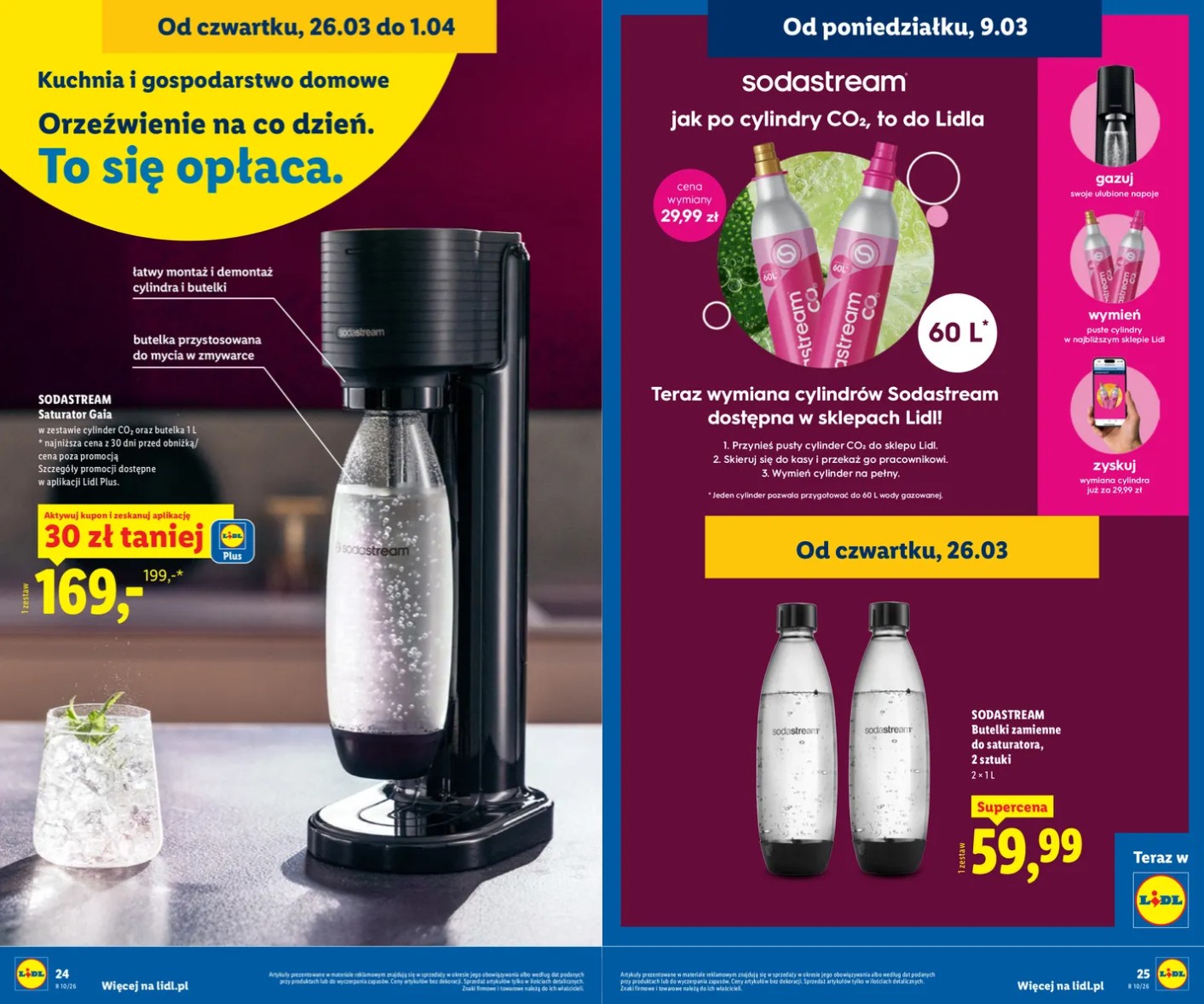 Saturatory do wody nie są w Polsce żadną nowością, wystarczy zapytać o to kogokolwiek, kto żył w PRL-u. Jednak w ostatnich latach przeżywają one istny renesans, głównie za sprawą marki SodaStream. Trudno się dziwić – urządzenie jest banalnie proste w obsłudze, nie wymaga prądu i pozwala w kilka sekund zamienić zwykłą „kranówkę” w mocno gazowany napój. W najnowszej ofercie Lidla, która startuje w czwartek 26 marca 2026 roku, zestaw SodaStream Gaia został przeceniony ze 199 zł na 169 zł. W pakiecie startowym dostajemy wszystko, co niezbędne, czyli samo urządzenie, cylinder z gazem CO2 oraz litrową butelkę wielokrotnego użytku.
