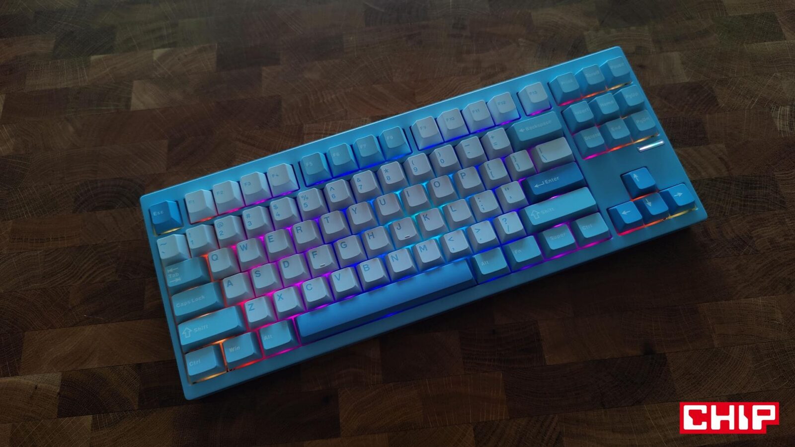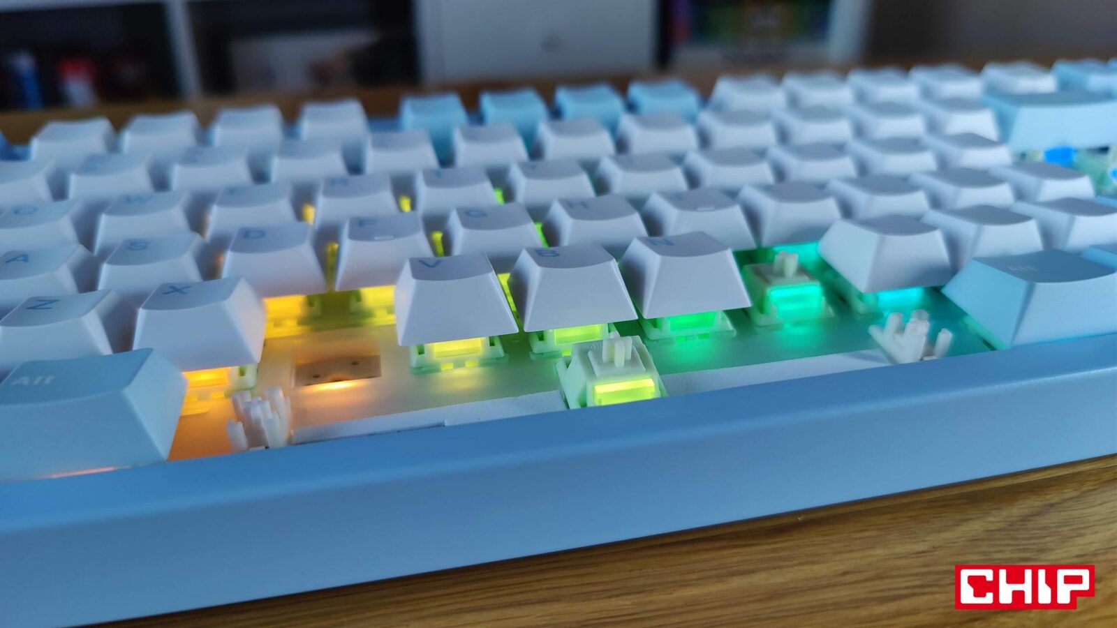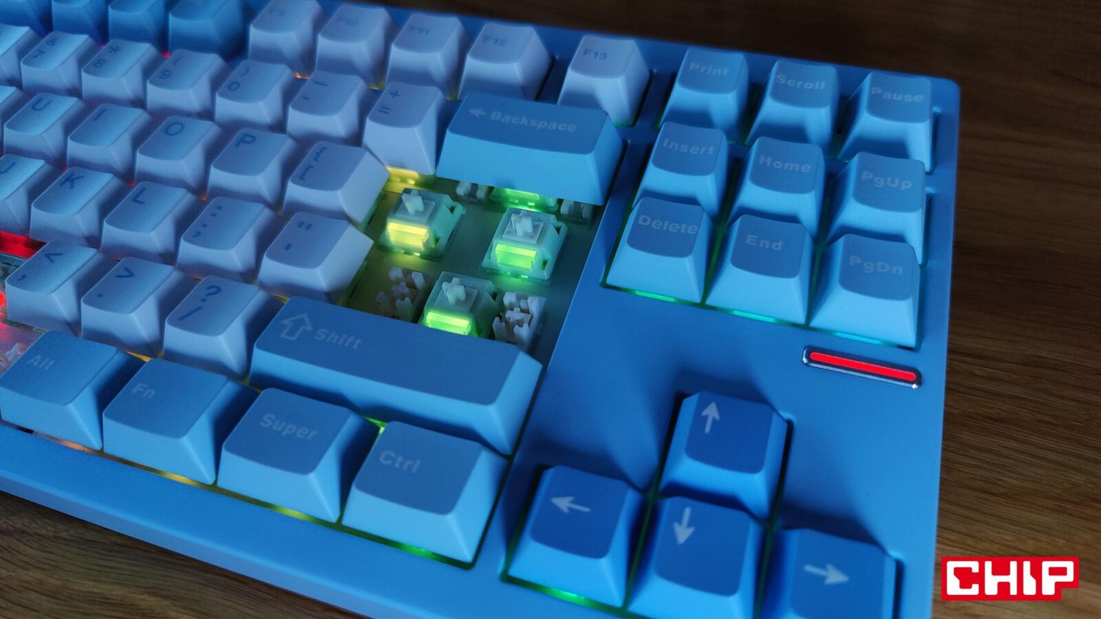 Jeśli szukać wad tego modelu, to na pierwszy plan wychodzi przede wszystkim podświetlenie, które nie zalicza się do najbardziej efektywnych niezależnie od wybranego trybu. Przestrzenie między klawiszami są podświetlone “poprawnie”, bo na rogach i bokach blasku po prostu brakuje, a gdyby tego było mało, klawisze nie posiadają przezroczystej czcionki, więc po zmroku jej czytelność spada. Ma to jednak swoich zwolenników, jak i przeciwników, bo z jednej strony takie klawisze zapewniają spójny wygląd, ale z drugiej cierpi na tym rzeczywiście sama czytelność po zmroku. Zwłaszcza że w tym wariancie kolorystycznym kontrast między tłem a symbolami nie należy do największych.