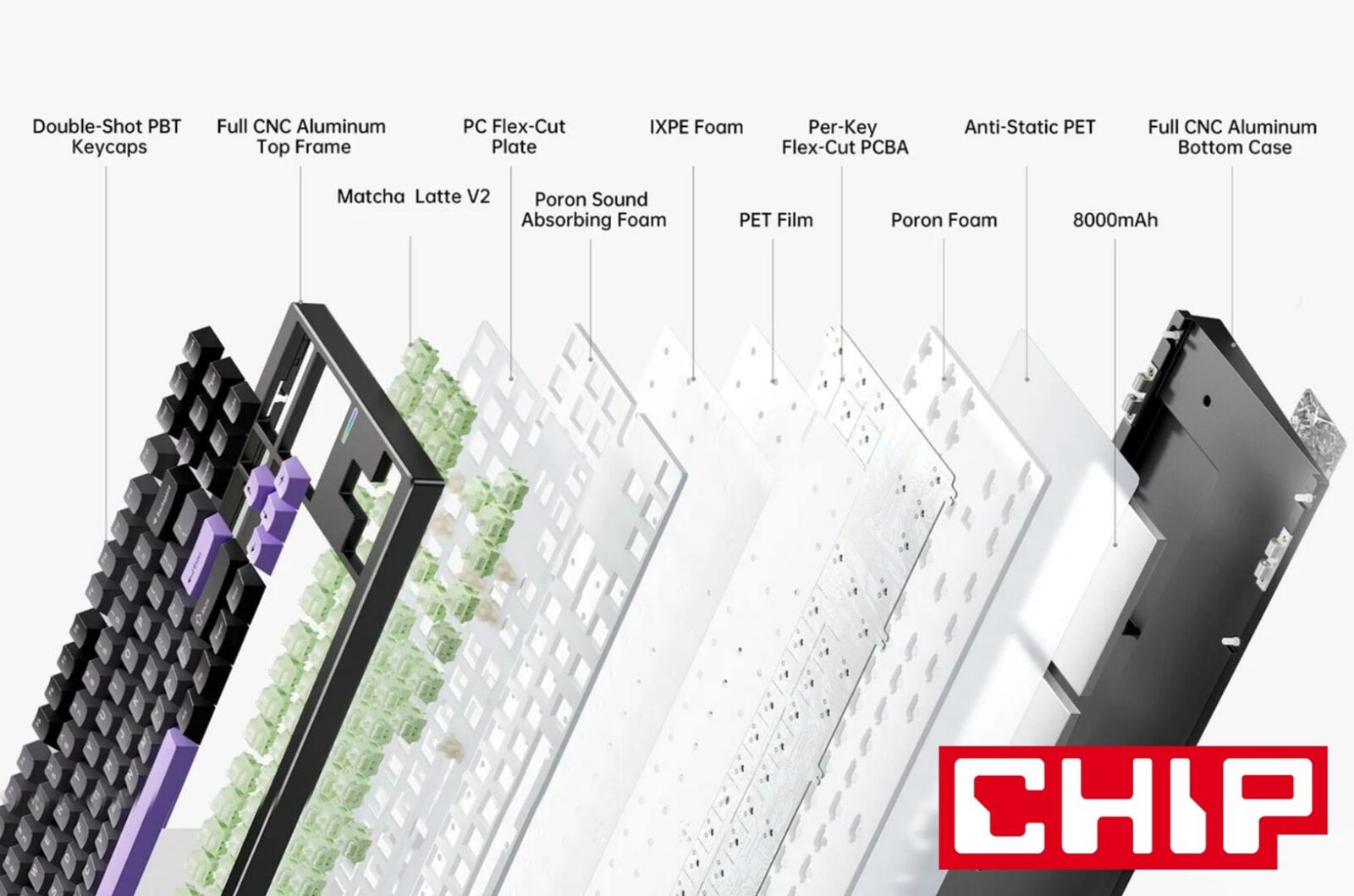 Obudowa wykrojona maszyną CNC ze stopu aluminium 6063, konstrukcja typu gasket mount, wsparcie prostej wymiany przełączników (hot-swap), trzy technologie łączności, pełne podświetlenie, duży akumulator 8000 mAh czy przełączniki HUANO Matcha Latte V2 – czego więc chcieć więcej? Sprawdźmy.