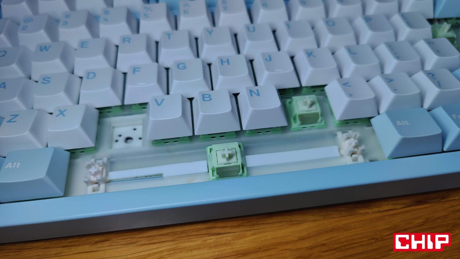 W MCHOSE GX87 Lite: Blue Nano Spraying producent zastosował przełączniki HUANO Matcha Latte V2. Są to liniowe switche, które można zaliczyć do rodzaju tych “bardziej agresywnych” w kwestii aktywacji, ale nie do przesady, w której ledwie muśnięcie klawisza wystarczy. Zdradza to charakterystyka, a więc 3,5-mm (+/- 0,2 mm) droga pracy, droga do aktywacji rzędu 2 mm (+/- 0,4 mm) oraz potrzebna siła rzędu 45 gramów do aktywacji i 53 gramów do “dobicia” do końca. Budowa wyróżnia się wyłącznie charakterystycznym kolorem nieprzezroczystej obudowy oraz trzpienia, przez co obecne pod przełącznikami pojedyncze diody RGB oświetlają tylko spód przełącznika.