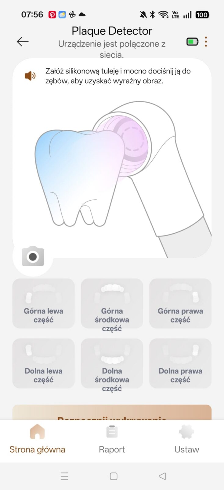 Sam detektor płytki nazębnej wykorzystuje kamerę endoskopową o rozdzielczości 300000 pikseli. Wspiera ją technologia rozpoznawania obrazu AI, która precyzyjnie wykrywa płytkę nazębną i pokazuje jej obecność w czasie rzeczywistym. Dzięki temu dokładnie widzicie w aplikacji, gdzie trzeba mocniej czyścić. Co więcej, szczoteczka ma tryb inteligentny, który wykorzystuje dane z detektora i intensywniej czyści w miejscach z wykrytą płytką nazębną. To właśnie z tego trybu najczęściej korzystałam podczas mycia zębów.