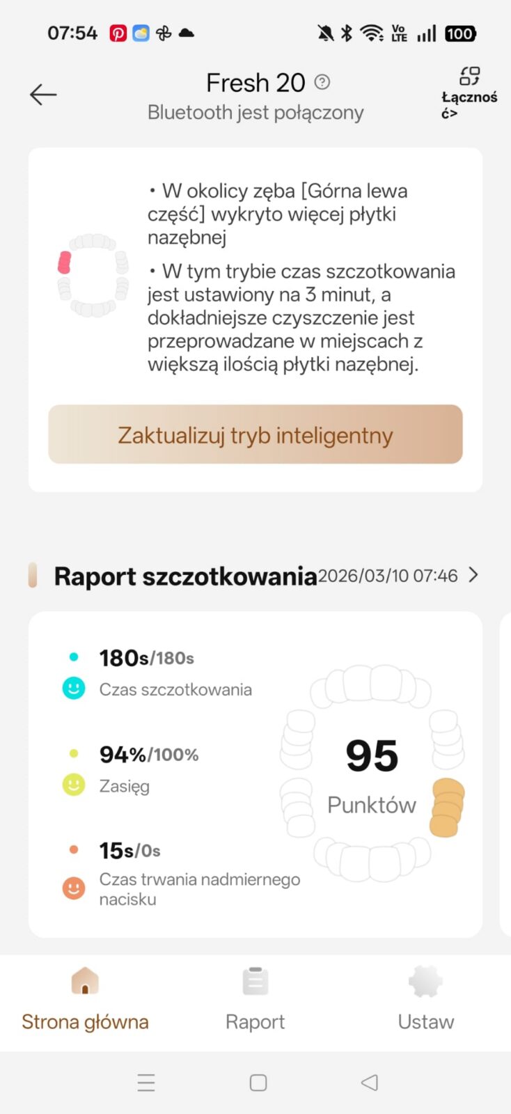 Możliwy jest wybór trybów czyszczenia: delikatny (dla wrażliwych dziąseł), inteligentny, wybielający dostosowanych do potrzeb użytkownika. Aplikacja również sama podpowiada, który z trybów jest dla nas najodpowiedniejszy. Czas trwania mycia zębów pokazany jest w formie elektronicznej na szczoteczce, po myciu jestem informowana w formie głosowej, że moje zęby są czyste i szczoteczka sama przestaje pracować. U mnie są to zwykle 2 lub 3 minuty w trybie inteligentnym, z którego najczęściej korzystałam. Wykorzystuje on bowiem informacje z detektora i rzeczywiście czuć podczas mycia, że miejsca z płytką są dokładnie czyszczone. Co więcej, po około dwóch miesiącach ilość wykrywanej płytki nazębnej zdecydowanie się zmniejszyła, co tylko pokazuje, jak skuteczna jest MOVA Fresh 20 Sensus. Nie tylko widać różnicę podczas robienia zdjęć zębom, ale również po prostu czuję, że są one znacznie lepiej doczyszczone.