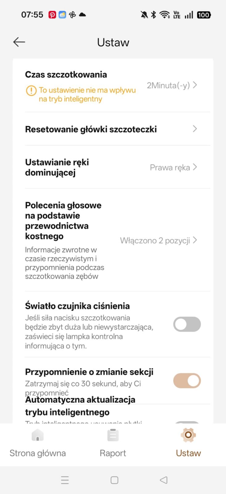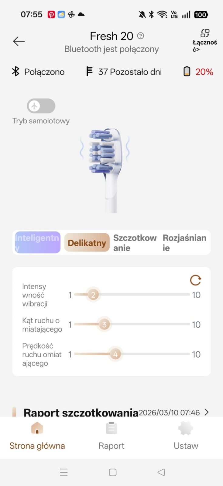 Aplikacja informuje o terminie wymiany główki szczoteczki, co jest przydatną funkcją. Bateria szczoteczki jest bardzo wytrzymała, nie wymaga częstego ładowania. Wystarczy wspomnieć, że naładowałam ją jakoś w połowie stycznia i do momentu publikacji recenzji ani razu nie doładowywałam. Aplikacja pozwala również na dokładne zarządzanie trybem czyszczenia, jeśli nie chcecie korzystać z trybu inteligentnego. Możecie tam ustawić 10 poziomów intensywności wibracji, 10 poziomów kątów zamiatania i 10 poziomów prędkości zamiatania. Oprócz podglądu ostatnich myć zębów zobaczycie też zdjęcia wykonane detektorem wraz z zaznaczoną płytką. Aplikacja jest w języku polskim oraz ma dokładne informacje o różnych opcjach. Prowadzi również za rękę przy pierwszych krokach z MOVA Fresh 20 Sensus.