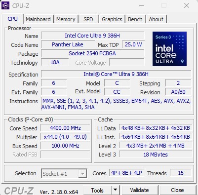 Procesor Intel Core Ultra 9 386H jeszcze pachnie nowością, bo zadebiutował w styczniu 2026 roku. Jego produkcją zajmuje się głównie Intel, wykorzystując swój 3-nm proces produkcyjny do głównych układów, a wcześniej słyszeliśmy o nim, kiedy ukrywał się jeszcze pod nazwą Panther Lake. Ten procesor oferuje 16 rdzeni w układzie 4P + 8E + 4 Low Power E, co przekłada się na łącznie 16 wątków (połowa z nich pochodzi z czterech Performance wspierających wielowątkowość). Podczas gdy rdzenie P rozkręcają się od 2,1 do 4,9 GHz, te energooszczędne ograniczają się do zakresu 1,6-3,7 GHz, a te ultra energooszczędne do 0,1-3,5 GHz.