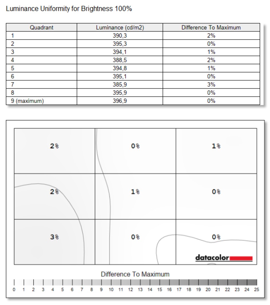 Równie ważna jest też wysoka jasność, bo przy 100% suwaka panel osiąga około 402,6 nitów, a przy 75% około 212,6 nitów, co jest dalekie do typowo biurowego poziomu 200-300 nitów. Jednorodność to kolejny punkt, który wypada lepiej, niż sugerowałaby sama klasa urządzenia. Różnice jasności w siatce pomiarowej mieszczą się w granicach kilku procent, a odchyłki barwne są na tyle małe, że nie ma mowy o “plamach” czy innej kolorystycznej loterii na białych tłach. Najciekawsze jest jednak to, że MSI daje użyteczne tryby przestrzeni barw. sRGB jest wyraźnie ograniczony pod treści internetowe i nieprzesadny w nasyceniu, P3 daje największą “soczystość” w materiałach wideo, a wypadający najlepiej całościowo AdobeRGB nadaje się do bardziej świadomej pracy z kolorami.