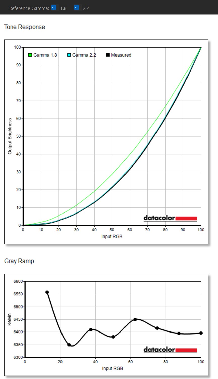 Pomiary wykazują przede wszystkim to, że nie jest to “OLED na pokaz”. Krzywa tonalna praktycznie pokrywa się z referencyjną gammą 2,2, więc obraz nie ma tendencji do rozjaśniania cieni ani do sztucznego przyciemniania półtonów. Zarówno filmy, jak i typowe programy w tradycyjnym formacie SDR wyglądają tak, jak powinny i bez wrażenia, że panel próbuje coś “poprawiać” na siłę. Do tego dochodzi stabilna skala szarości z bielą blisko D65 – w większości zakresu jest to około 6350-6450 K, czyli bez typowej, zimnej dominanty, która potrafi zmęczyć w dłuższej pracy.