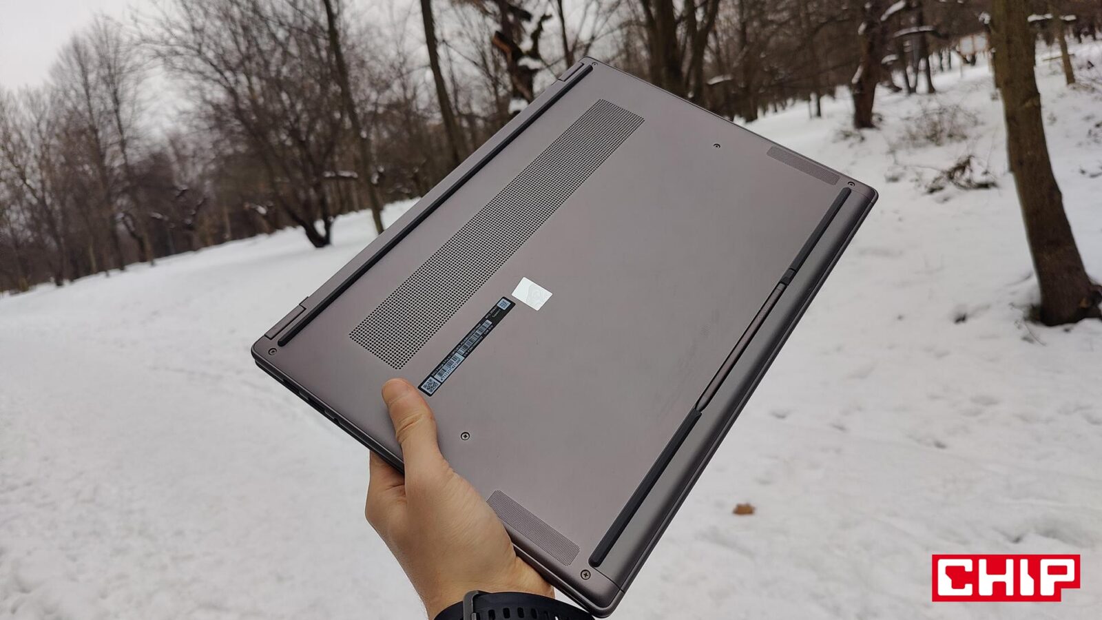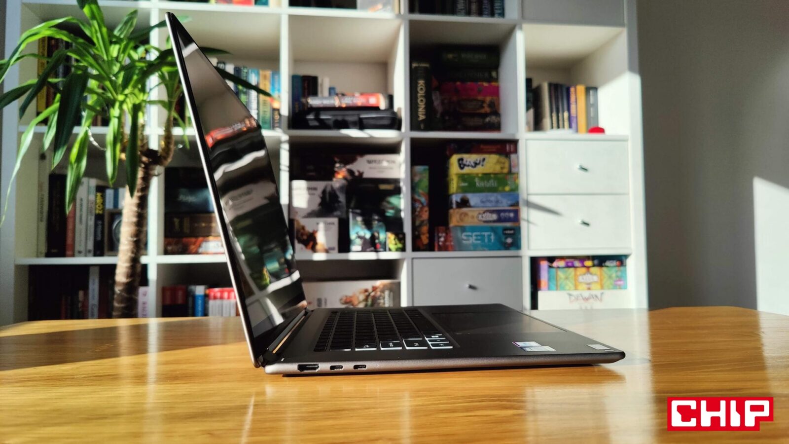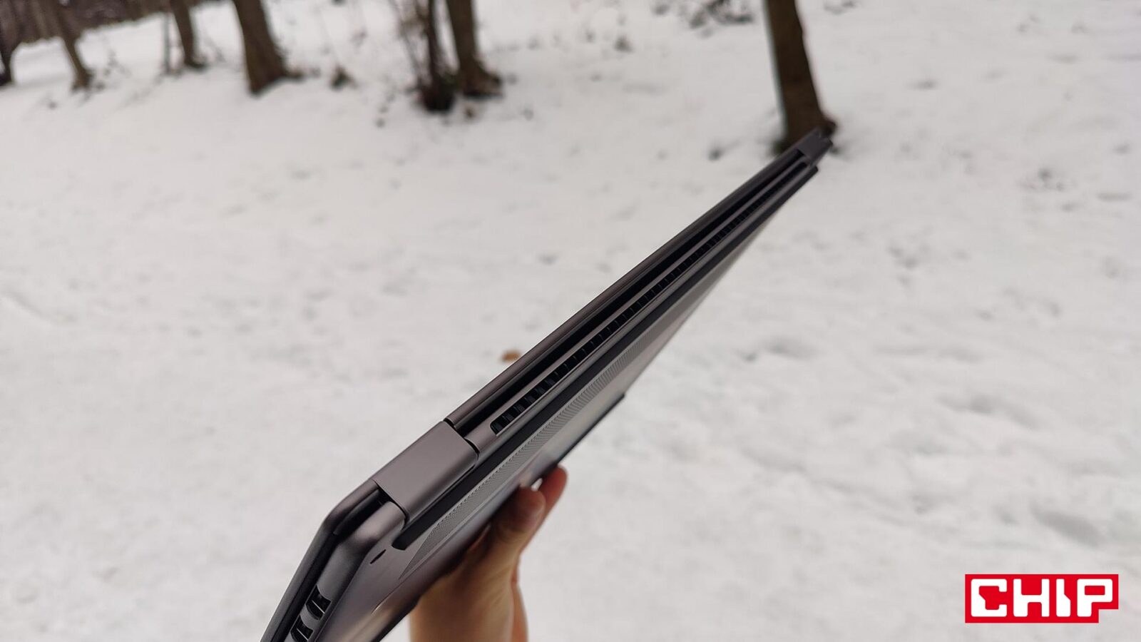 Wątpliwości co do jakości nie budzi też przenoszenie laptopa po chwyceniu za jeden z rogów podstawy, a to wszystko dzięki zastosowaniu aluminium w kolorze Platinium Gray (ciemny szary), które dba też o niską wagę rzędu 1,66 kg. Nieźle, jak na 16-calowego ultrabooka o wielkości 357 x 253 x 11,9-13,9 mm, który doczekał się też certyfikacji MIL-STD-810H/G. W kwestii wykonania trudno się tak naprawdę do czegokolwiek przyczepić. Nawet sposób działania zawiasu jest wzorowy, bo liniowy w całym zakresie i na tyle “mocny”, że nawet w skrajnym wychyleniu nie ma miejsce moment, w którym “ekran sam opada”.