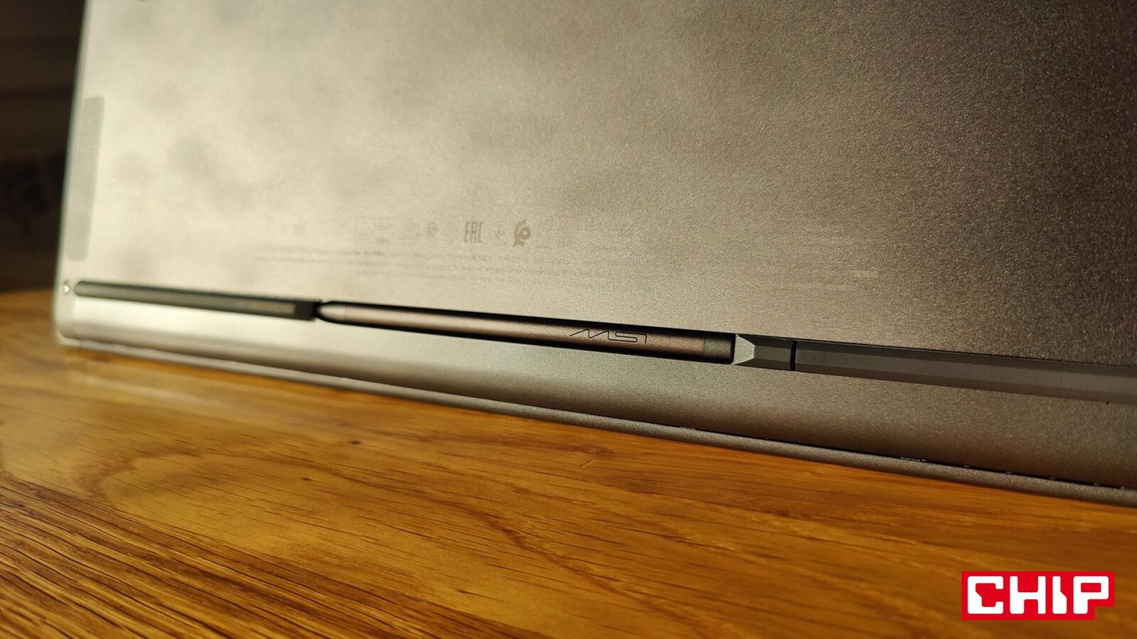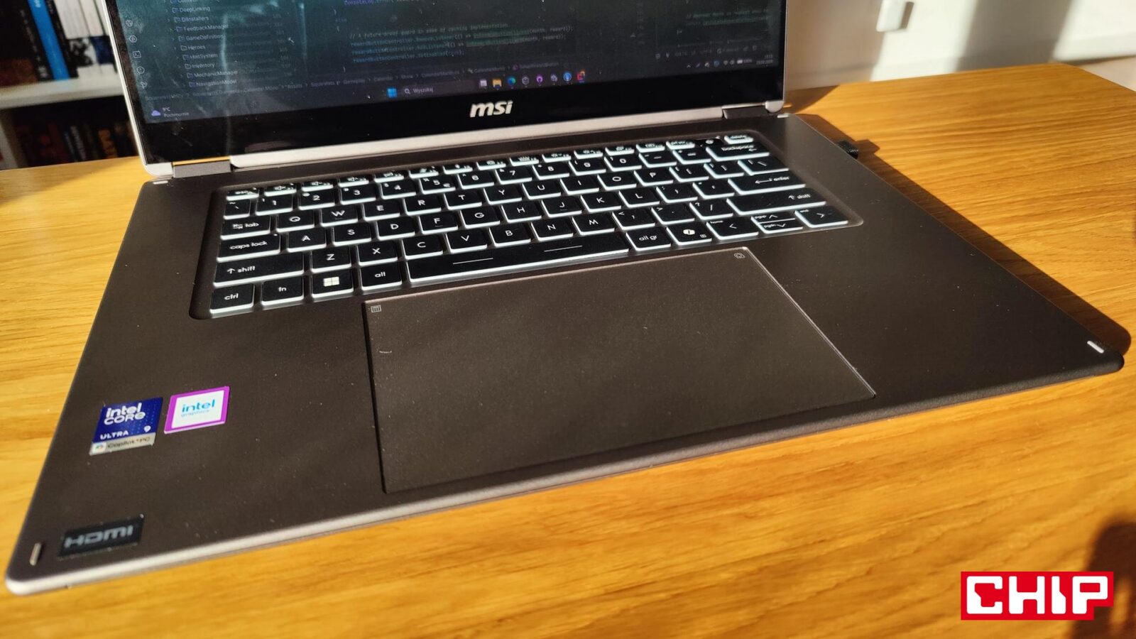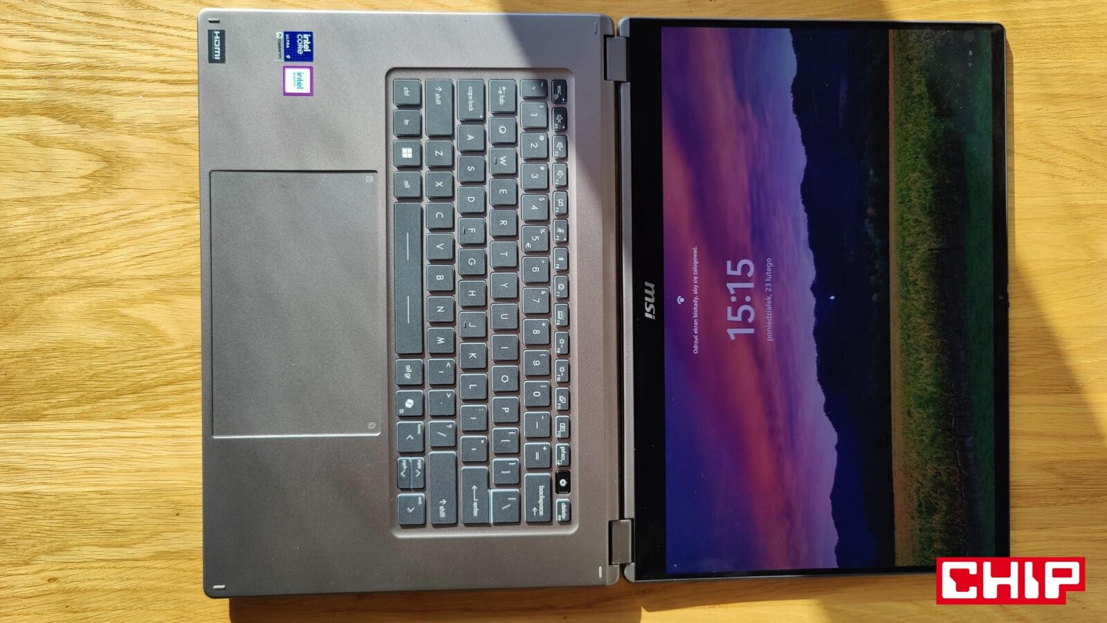 Chociaż ten ultrabook od MSI jest cienki, to tego samego nie można powiedzieć o belkach wyświetlacza. Na spodzie znalazł się bowiem aż 2-cm czarny pas, a na górze dwa razy chudszy, bo mierzący około 9 mm, ale na szczęście te boczne są niewielkie (około 5 mm). Między nimi znalazł się jednak pewnego rodzaju klejnot tego modelu, bo 16-calowy panel OLED o rozdzielczości 2.8K (2880 x 1800) o odświeżaniu rzędu 120 Hz z pokryciem 100% DCI-P3 i certyfikatem VESA DisplayHDR True Black 600. Do tego dochodzą certyfikaty SGS dla niskiego światła niebieskiego oraz braku migotania, plus dotyk i dobre wsparcie rysika (tabletu graficznego z tego nie zrobicie, ale do notatek nadaje się w sam raz).