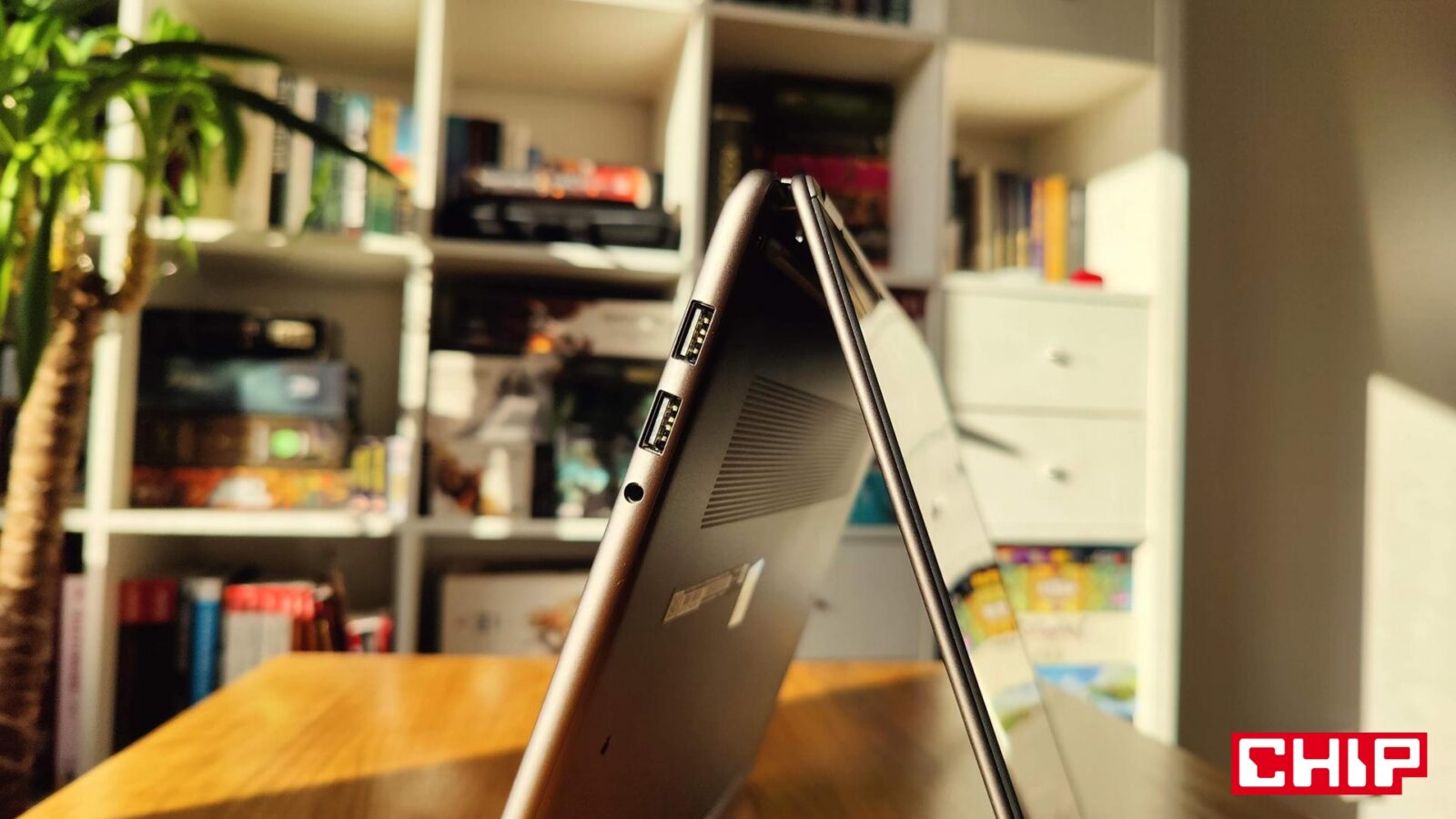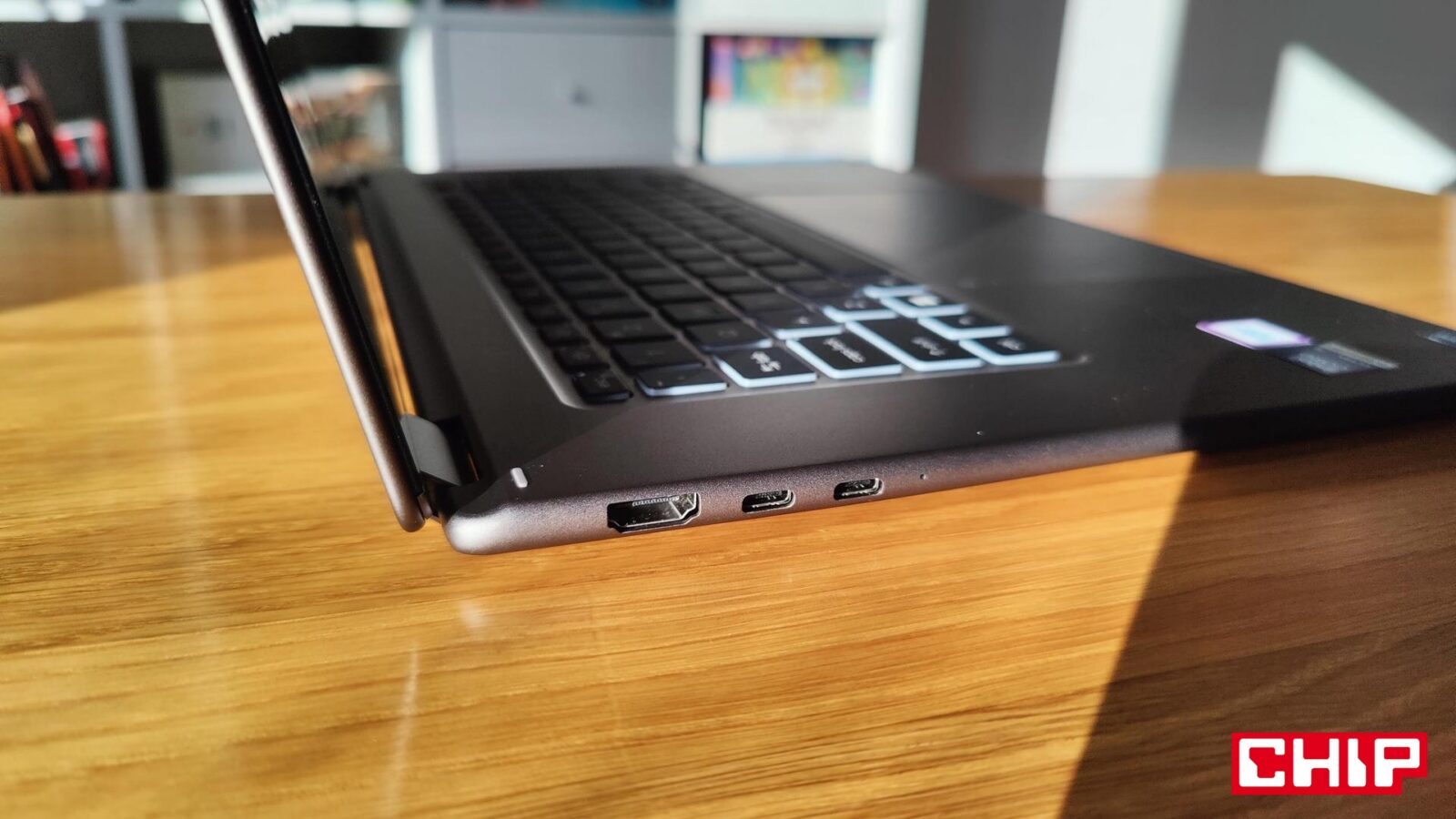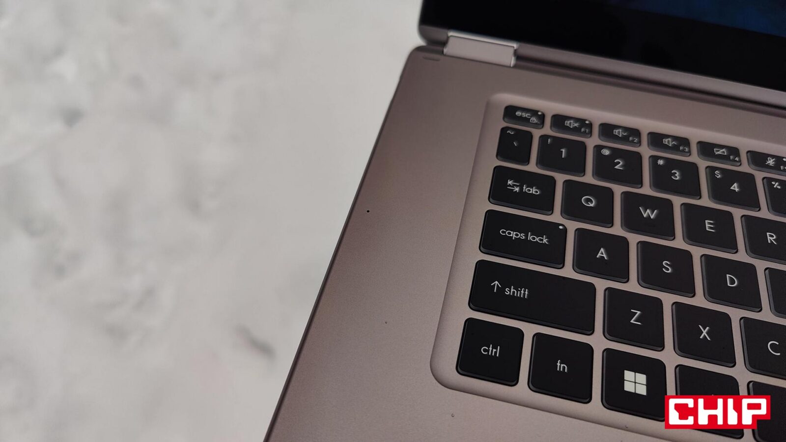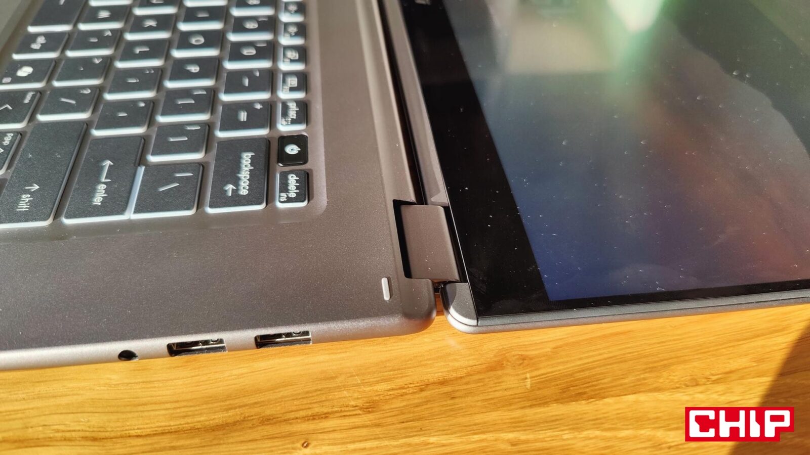 Wchodząc w szczegóły, klawiatura dezaktywuje się lub aktywuje po przekroczeniu obrotu ekranu ponad/poniżej 180 stopni, podczas gdy sam dotyk jest ciągle aktywny. Projektanci zadbali o to, aby cała ta hybrydowość ultrabooka nie budziła wątpliwości co do wytrzymałości, bo jego klawisze wpuszczone na tyle, że nie wciskają się wszystkie po obróceniu do góry nogami. Bryła opiera się bowiem nie tylko na gumowych podkładkach, ale przede wszystkim na samej obudowie, która wygina się pod naciskiem, ale nie do niepokojącego stopnia, który może doprowadzić do wyłączenia/awarii sprzętu. Przynajmniej przy racjonalnym sposobie użytkowania, bo nawet mocniej stukając w klawiaturę z klawiszami o białym podświetleniu (mechanizm aktywacji jest ot dobry), nie poczujecie wspomnianego wyginania się.