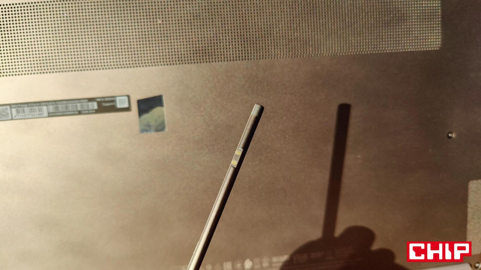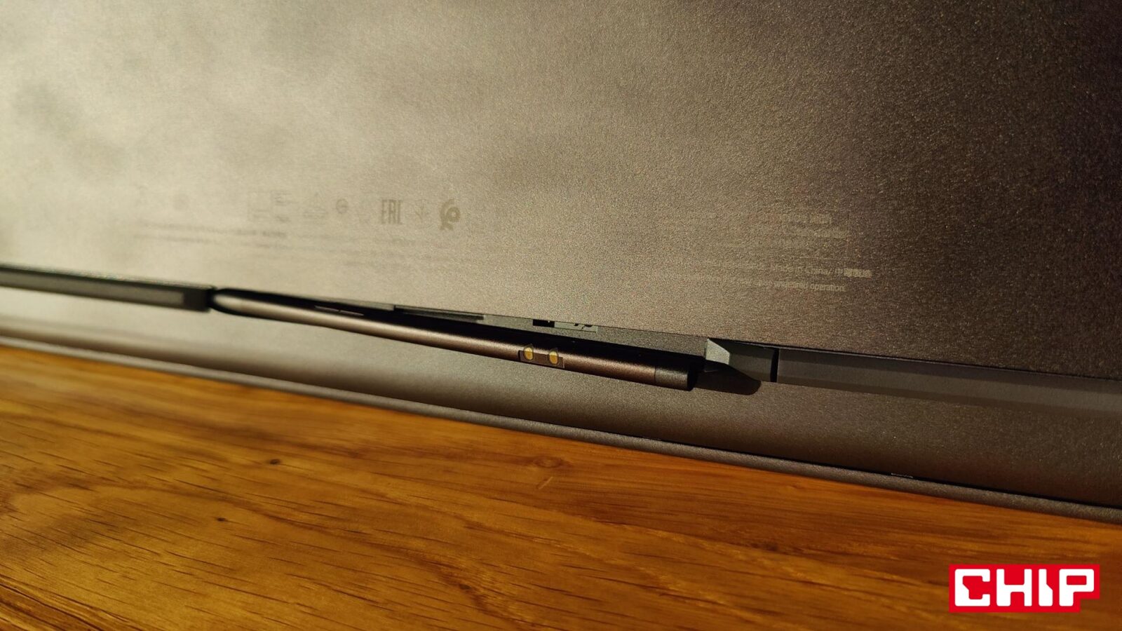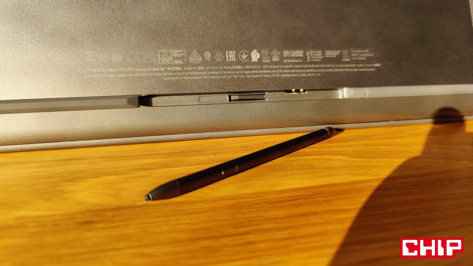 MSI Prestige 16 Flip AI+ C3MTG-067PL dociera do nas we wręcz “biznesowym” pudełku, które jednoznacznie potwierdza, z jakim sprzętem mamy do czynienia. Wyposażenie? Ładowarka o mocy 65 watów ze zintegrowanym przewodem USB-C oraz rysik MSI Nano Pen z dwoma przyciskami, pinami ładującymi oraz diodą funkcyjną. Ten nie jest ot byle dodatkiem “do szuflady”, a elementem, którego możemy “schować” w spodnią część laptopa i nie martwić się, że wypadnie przy pierwszym lepszym uderzeniu. Jest to bardzo dobre podejście, bo z jednej strony rysik mamy ciągle pod ręką, a on sam pozostaje w ciągłej gotowości.