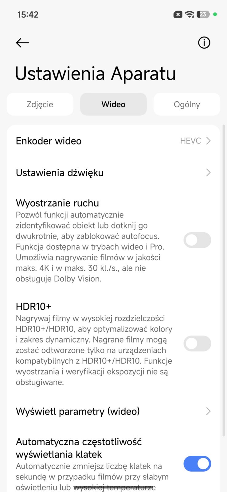 Od strony wideo POCO X8 Pro Max również nie wygląda źle na papierze. Tylny aparat nagrywa w 4K przy 30 lub 60 kl./s, w 1080p przy 30 lub 60 kl./s oraz w 720p przy 30 kl./s. Do tego dochodzi slow motion w 720p i 1080p przy 120, 240 i nawet 960 kl./s, a także teleprompter, podwójne wideo, tryb poklatkowy, ShootSteady oraz śledzenie ostrości w ruchu. Przedni aparat jest skromniejszy, bo kończy na 1080p przy 60 kl./s i 720p przy 30 kl./s, ale nadal oferuje selfie w zwolnionym tempie, tryb poklatkowy, podwójne wideo i teleprompter. W praktyce nagrania z głównego aparatu są po prostu porządne, stabilne i w pełni wystarczające do codziennego użycia, ale znów – bardziej jako funkcjonalny dodatek niż coś, co samo z siebie buduje przewagę nad konkurencją.