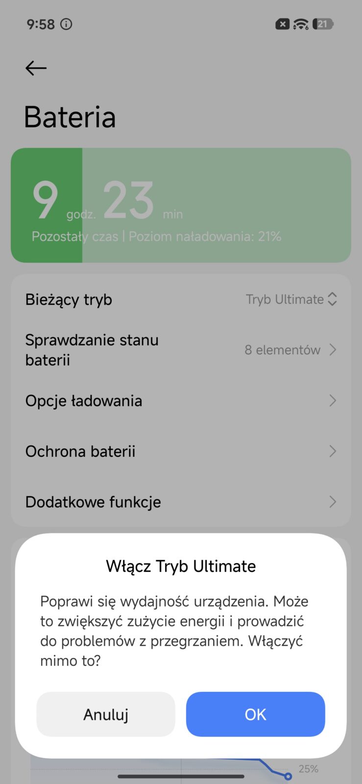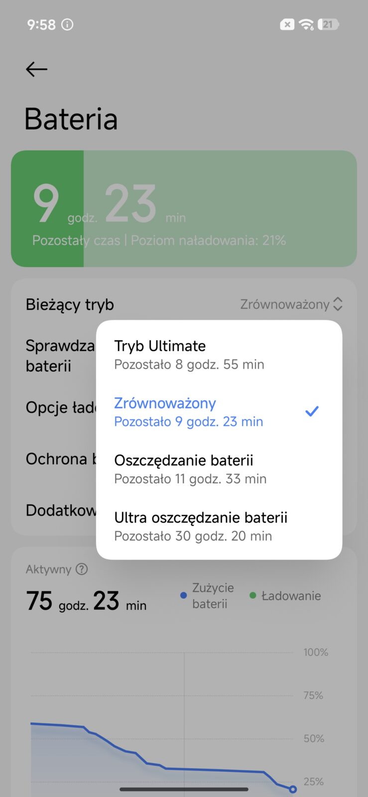 Maksymalnie w grę wchodzi 100 watów, ale oczywiście wymaga to odpowiedniej ładowarki i to nie tylko pod kątem mocy, ale też obsługiwanych protokołów ładowania (100-watów gwarantuje tylko HyperCharge). Przykładowo u mnie (zdawałoby się) zaawansowana ładowarka-gigant o mocy setek watów była w stanie wtłaczać jedynie 30 watów w POCO X8 Pro Max, co powodowało, że w godzinę akumulator ładował się do 80%, a pełne 100% osiągał dopiero po 90 minutach. Z drugiej strony takie wolne ładowanie wydłuża trwałość akumulatora, więc to nie tak, że trzeba koniecznie sięgać po maksymalną dostępną moc.
