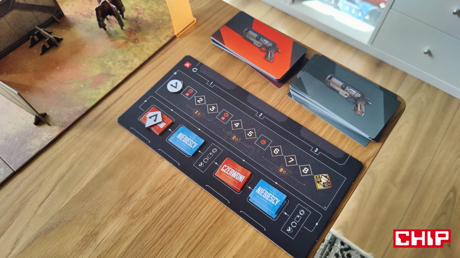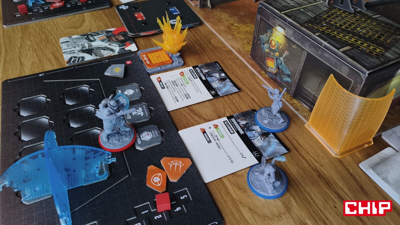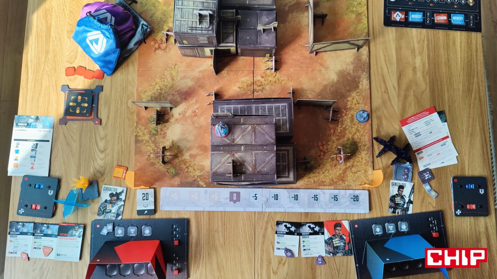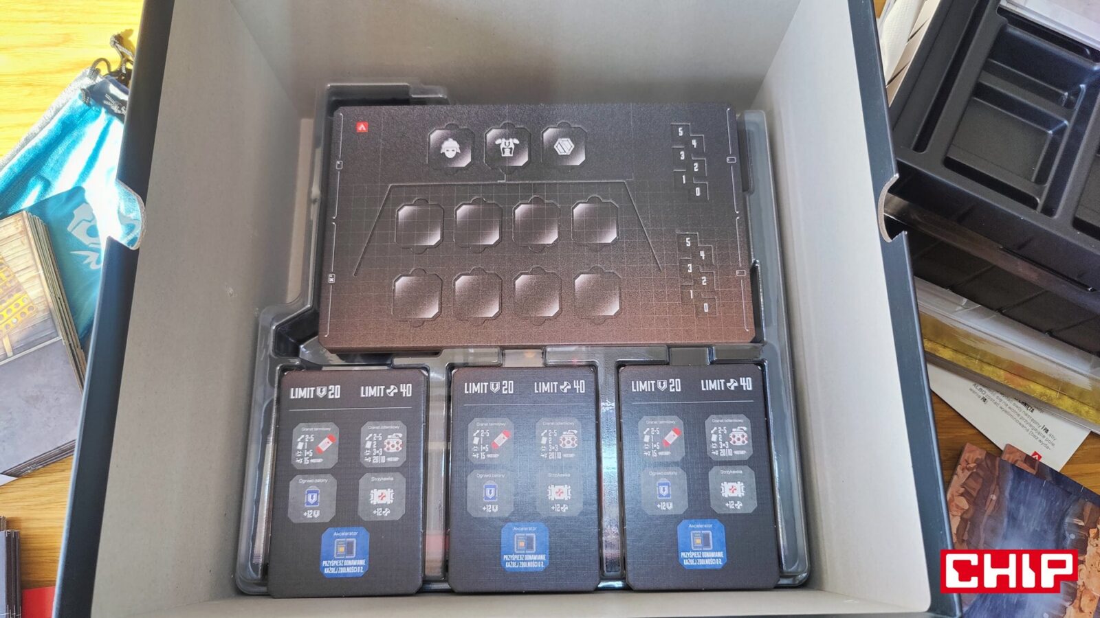 Nie znaczy to jednak, że w trakcie partii wszystko działa idealnie. Apex ma momenty, w których wyraźnie czuć planszówkową “biurokrację”. Rozpatrywanie niektórych akcji, pilnowanie żetonów, operowanie wyposażeniem i czytanie sytuacji na planszy potrafią spowolnić tempo, zwłaszcza gdy przy stole są osoby dopiero uczące się systemu. To trochę paradoks, bo sama gra chce być dynamiczna, agresywna i pełna krótkich zrywów, ale od czasu do czasu wpada w rytm bardziej analityczny niż intuicyjny. Nie wszystkim to będzie przeszkadzać, ale jeśli ktoś liczy na czystą, płynną akcję bez przestojów, to tutaj może się nieco odbić od ściany. Żonglerka zasobami również jest spora, więc obok głównego stołu, warto mieć dodatkową przestrzeń na elementy usunięte z gry, aby nie zawadzały one ciągle przy głównej planszy.