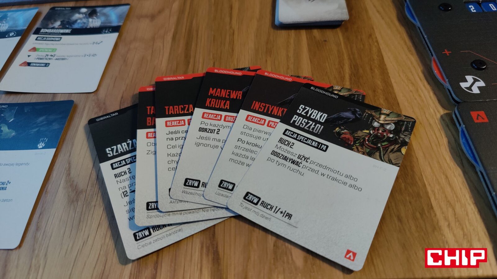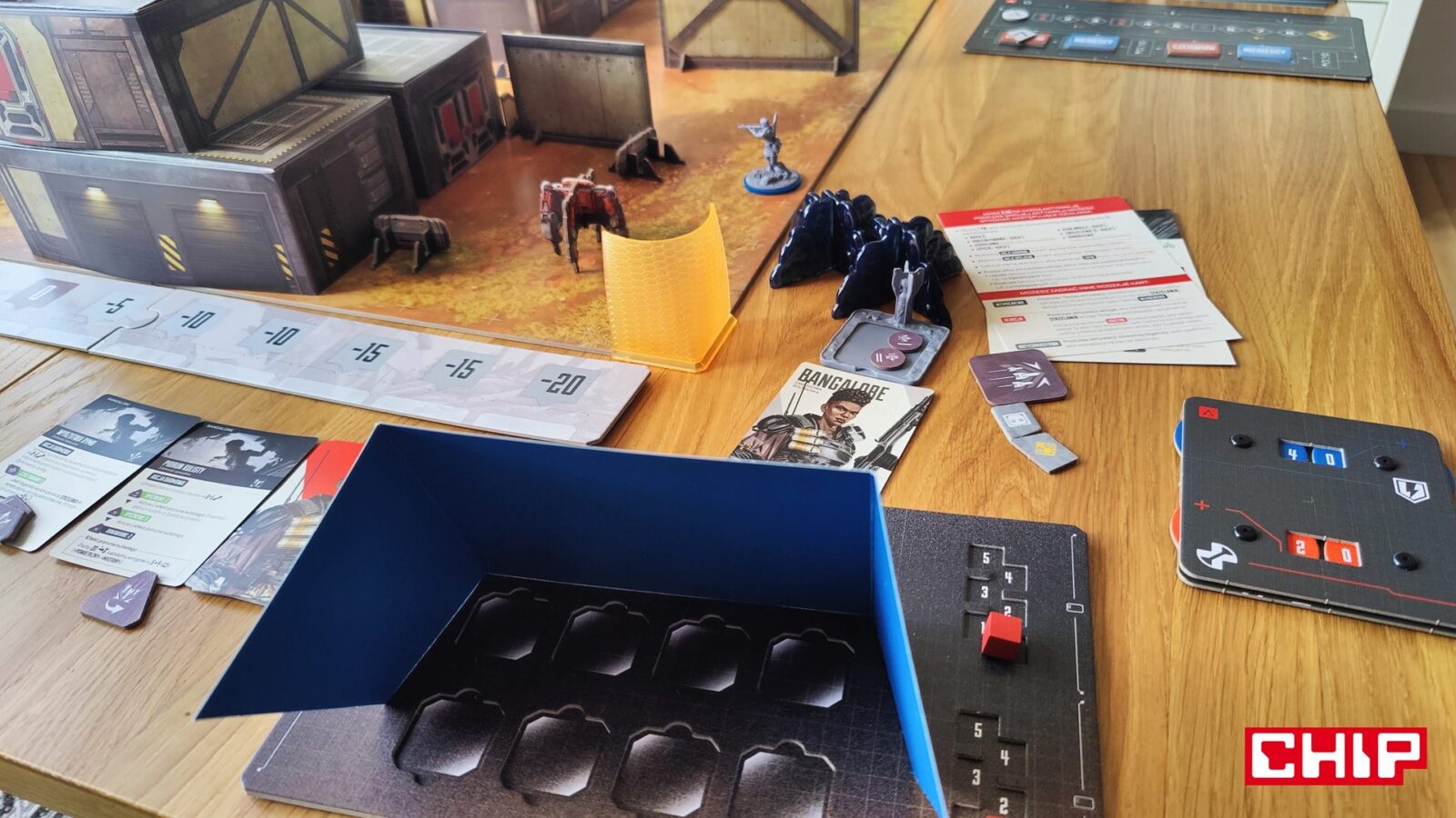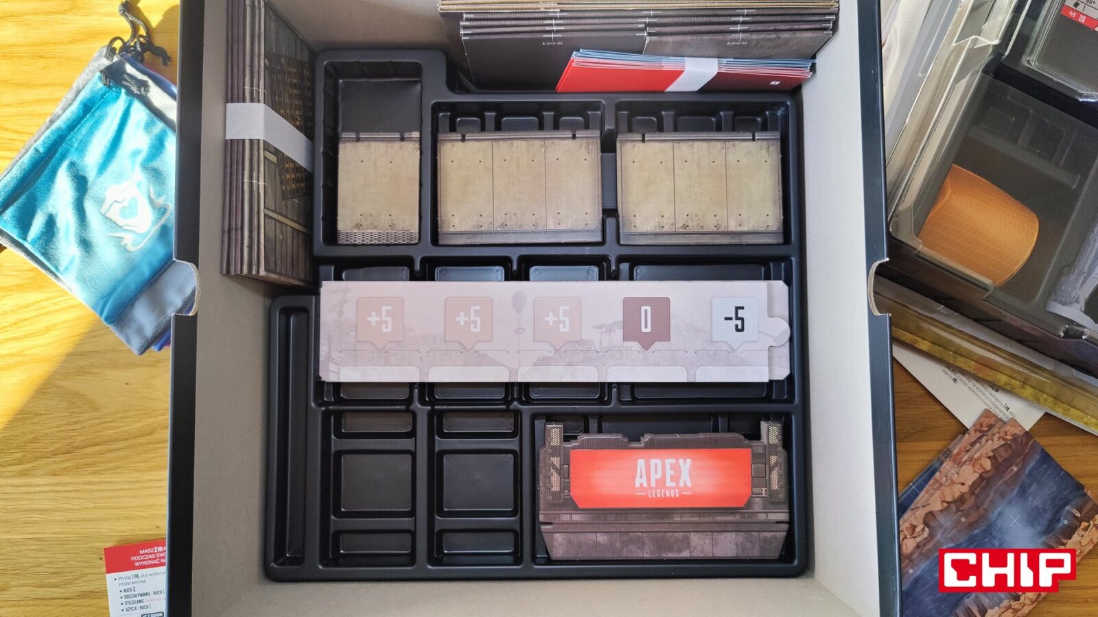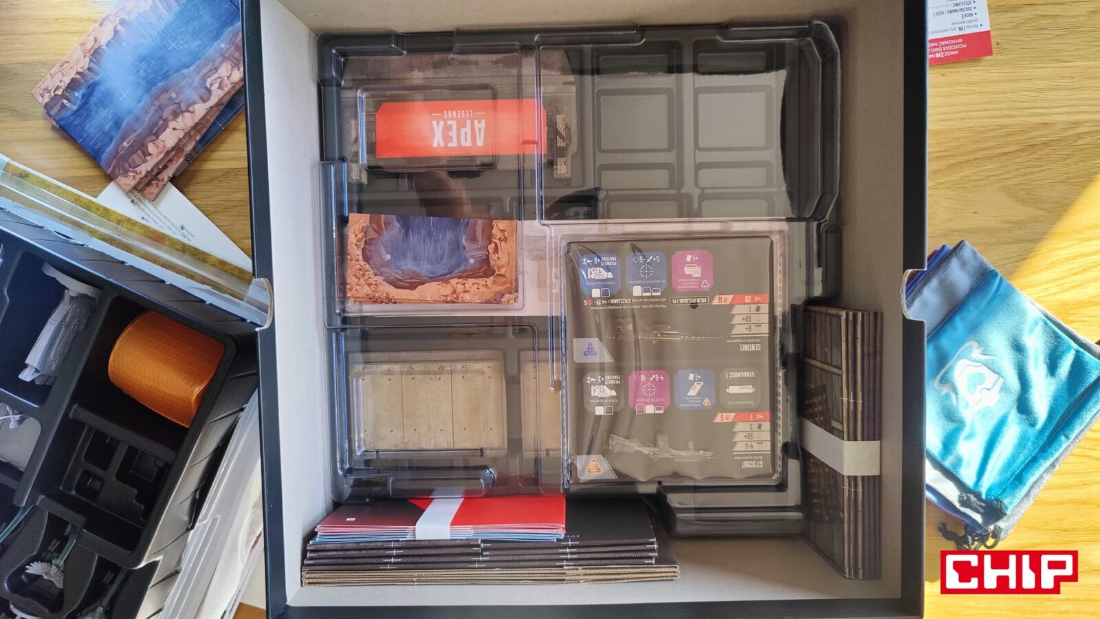 Nie znaczy to jednak, że w trakcie partii wszystko działa idealnie. Apex ma momenty, w których wyraźnie czuć planszówkową “biurokrację”. Rozpatrywanie niektórych akcji, pilnowanie żetonów, operowanie wyposażeniem i czytanie sytuacji na planszy potrafią spowolnić tempo, zwłaszcza gdy przy stole są osoby dopiero uczące się systemu. To trochę paradoks, bo sama gra chce być dynamiczna, agresywna i pełna krótkich zrywów, ale od czasu do czasu wpada w rytm bardziej analityczny niż intuicyjny. Nie wszystkim to będzie przeszkadzać, ale jeśli ktoś liczy na czystą, płynną akcję bez przestojów, to tutaj może się nieco odbić od ściany. Żonglerka zasobami również jest spora, więc obok głównego stołu, warto mieć dodatkową przestrzeń na elementy usunięte z gry, aby nie zawadzały one ciągle przy głównej planszy.