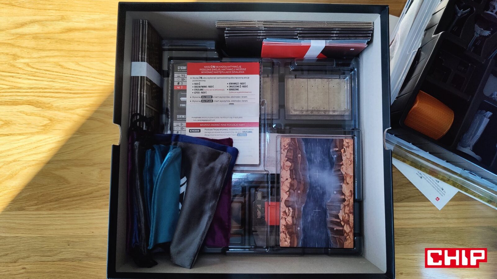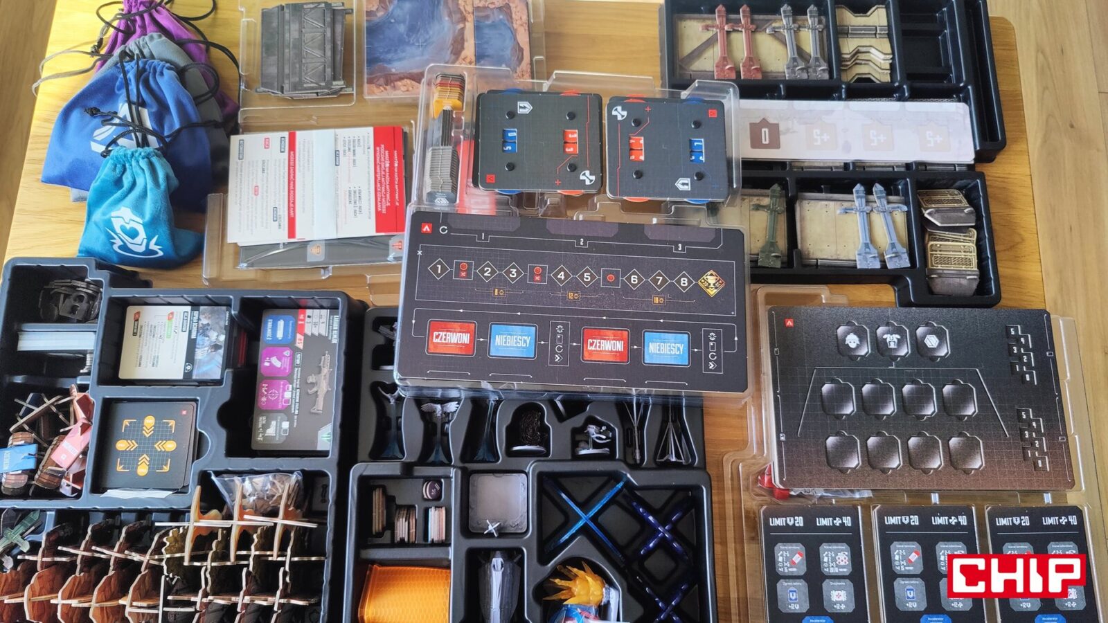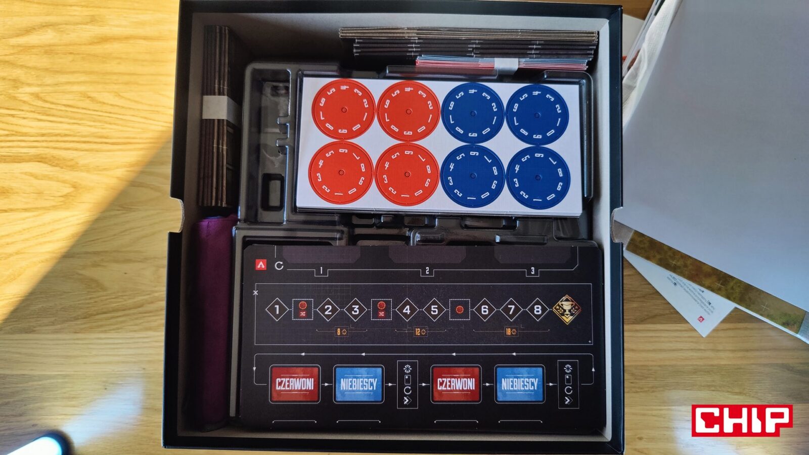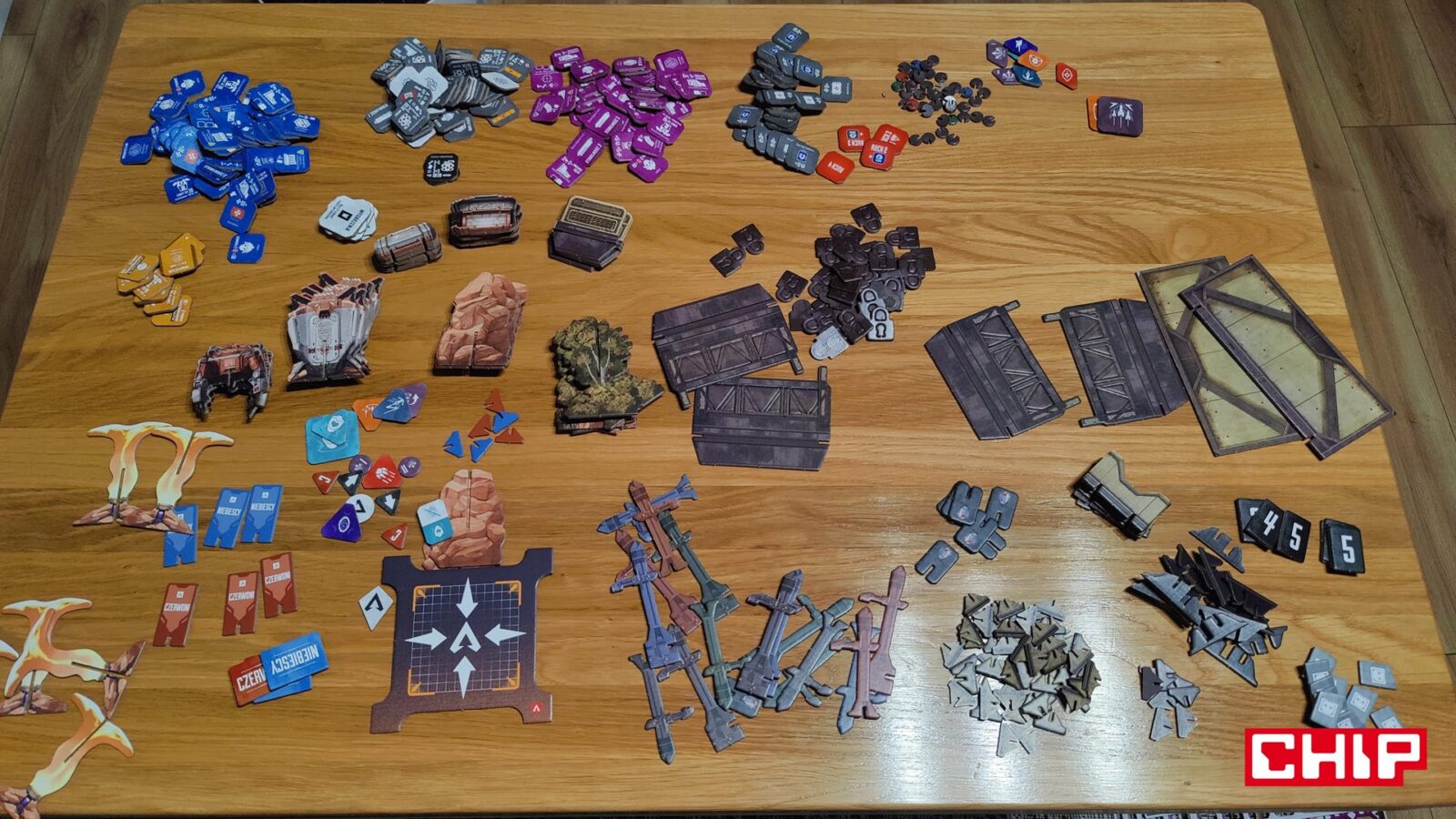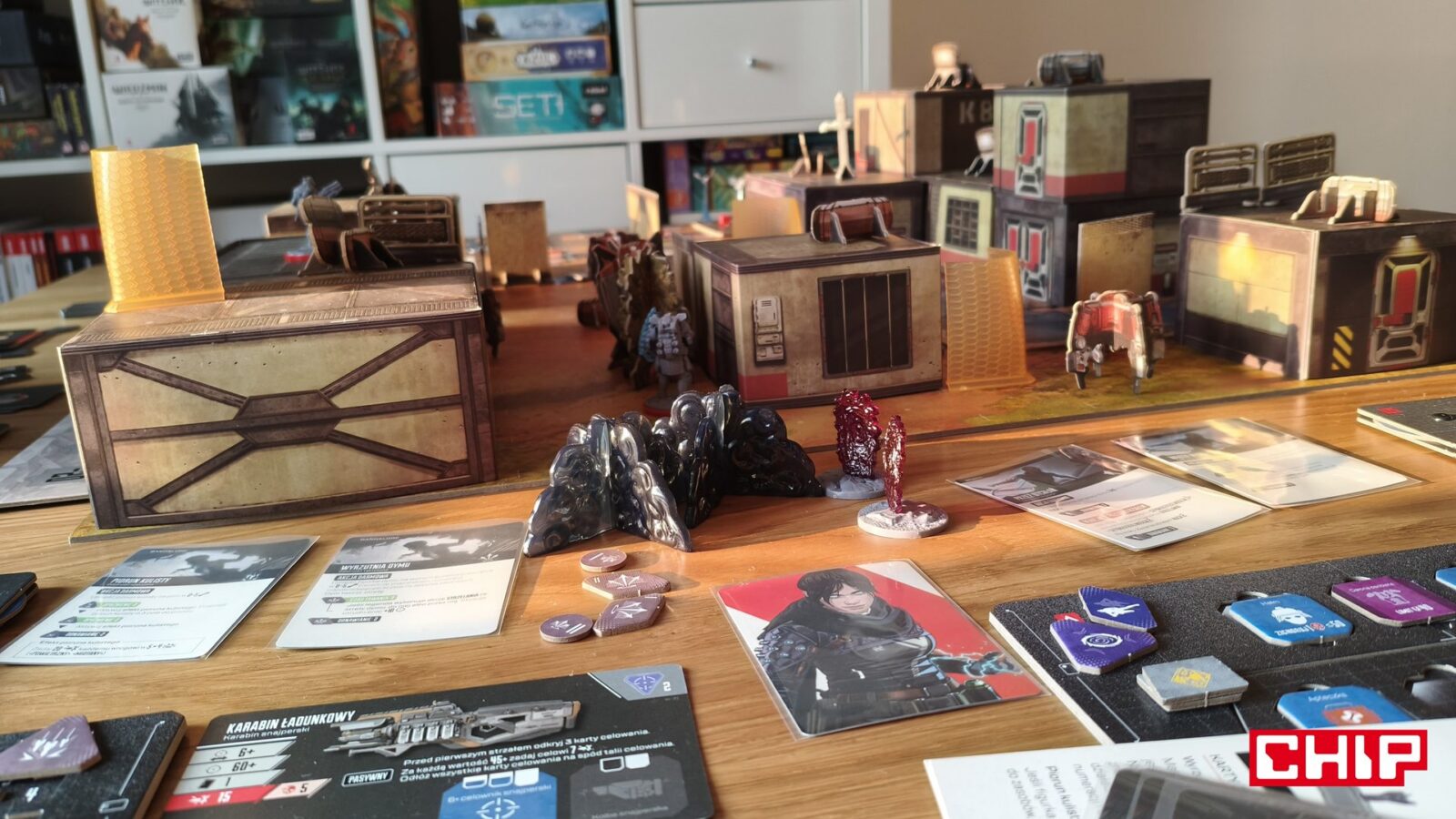 Nie znaczy to jednak, że w trakcie partii wszystko działa idealnie. Apex ma momenty, w których wyraźnie czuć planszówkową “biurokrację”. Rozpatrywanie niektórych akcji, pilnowanie żetonów, operowanie wyposażeniem i czytanie sytuacji na planszy potrafią spowolnić tempo, zwłaszcza gdy przy stole są osoby dopiero uczące się systemu. To trochę paradoks, bo sama gra chce być dynamiczna, agresywna i pełna krótkich zrywów, ale od czasu do czasu wpada w rytm bardziej analityczny niż intuicyjny. Nie wszystkim to będzie przeszkadzać, ale jeśli ktoś liczy na czystą, płynną akcję bez przestojów, to tutaj może się nieco odbić od ściany. Żonglerka zasobami również jest spora, więc obok głównego stołu, warto mieć dodatkową przestrzeń na elementy usunięte z gry, aby nie zawadzały one ciągle przy głównej planszy.
