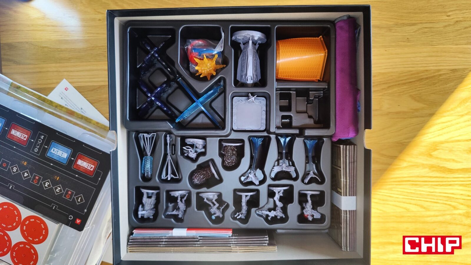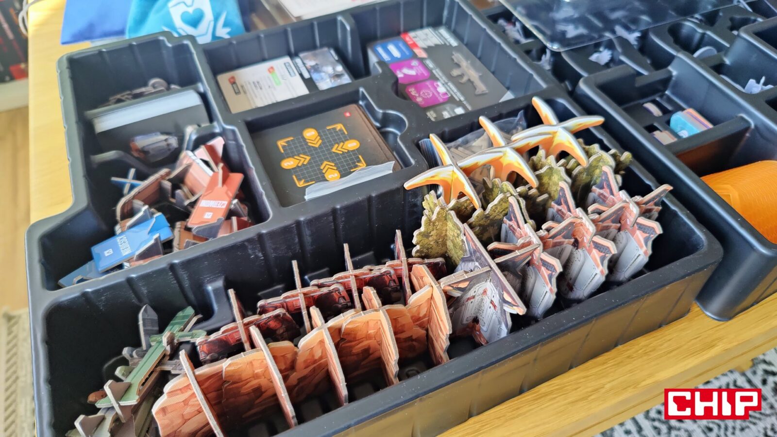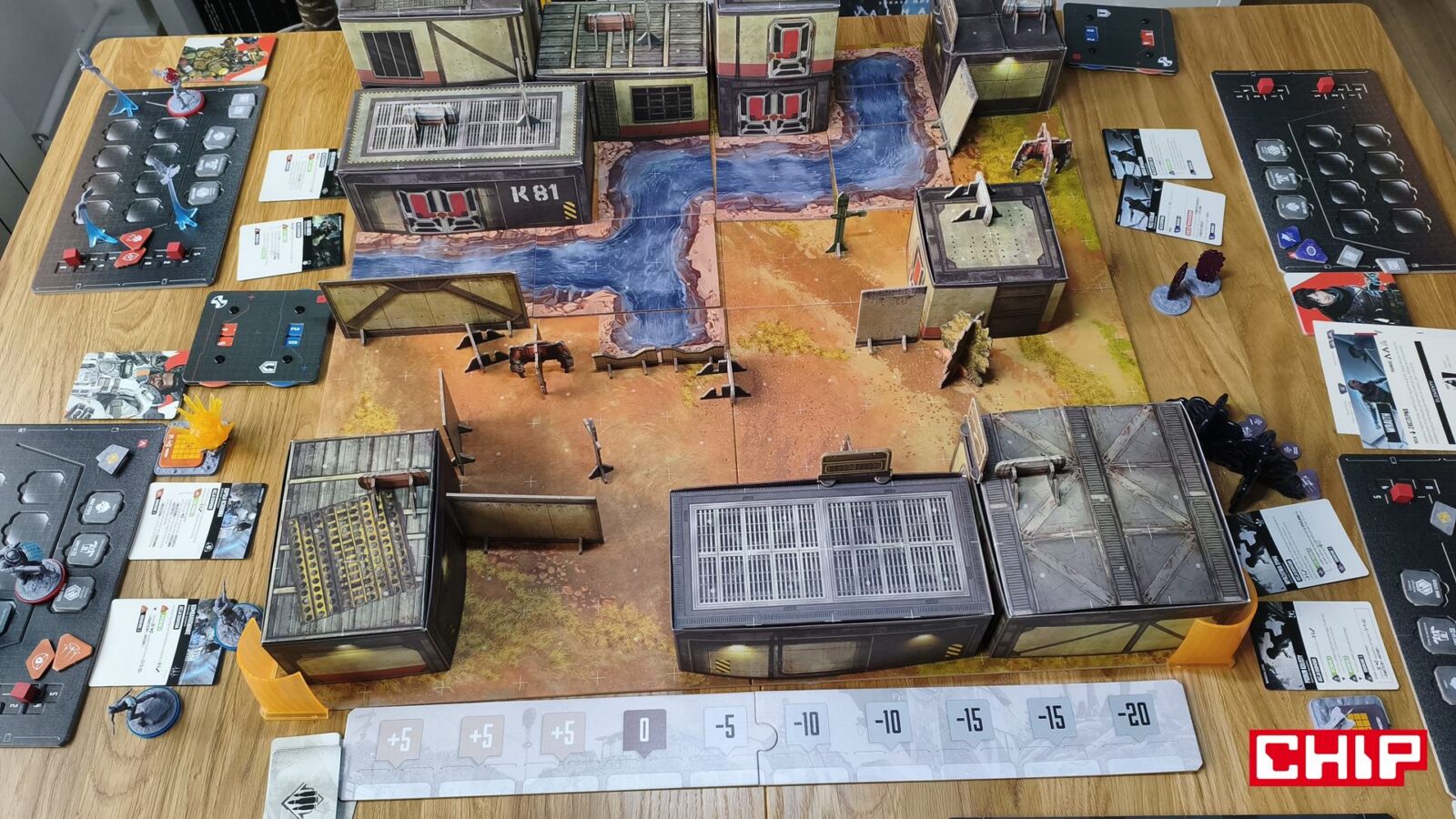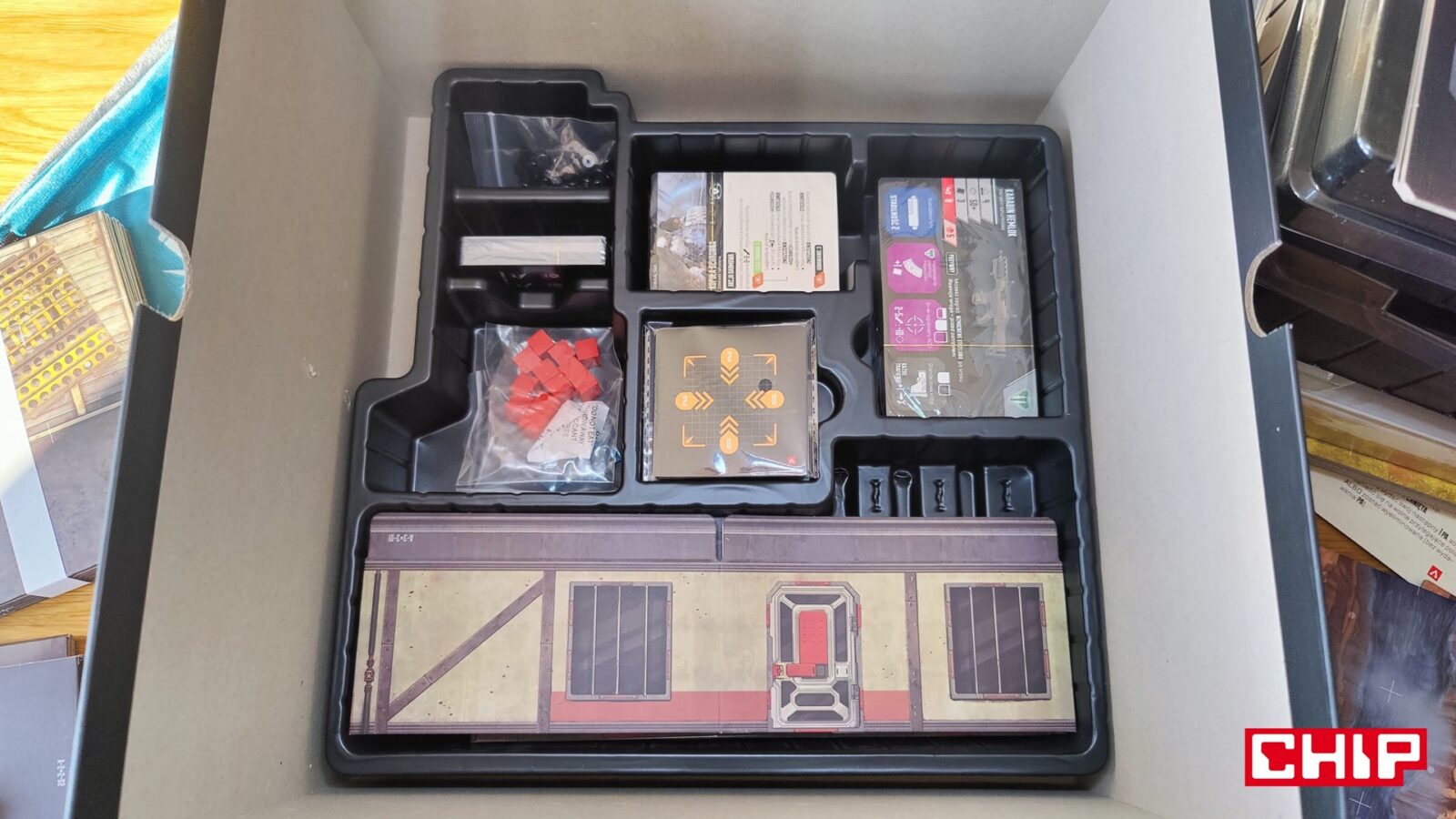 Nie znaczy to jednak, że w trakcie partii wszystko działa idealnie. Apex ma momenty, w których wyraźnie czuć planszówkową “biurokrację”. Rozpatrywanie niektórych akcji, pilnowanie żetonów, operowanie wyposażeniem i czytanie sytuacji na planszy potrafią spowolnić tempo, zwłaszcza gdy przy stole są osoby dopiero uczące się systemu. To trochę paradoks, bo sama gra chce być dynamiczna, agresywna i pełna krótkich zrywów, ale od czasu do czasu wpada w rytm bardziej analityczny niż intuicyjny. Nie wszystkim to będzie przeszkadzać, ale jeśli ktoś liczy na czystą, płynną akcję bez przestojów, to tutaj może się nieco odbić od ściany. Żonglerka zasobami również jest spora, więc obok głównego stołu, warto mieć dodatkową przestrzeń na elementy usunięte z gry, aby nie zawadzały one ciągle przy głównej planszy.