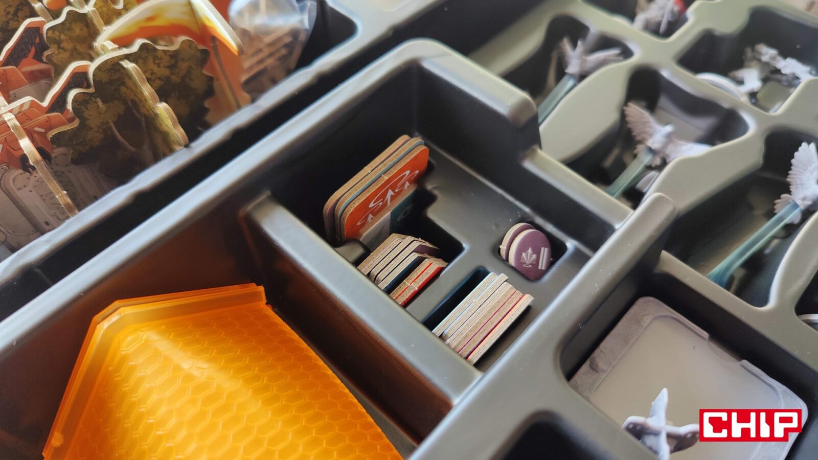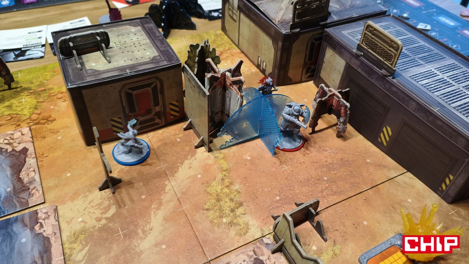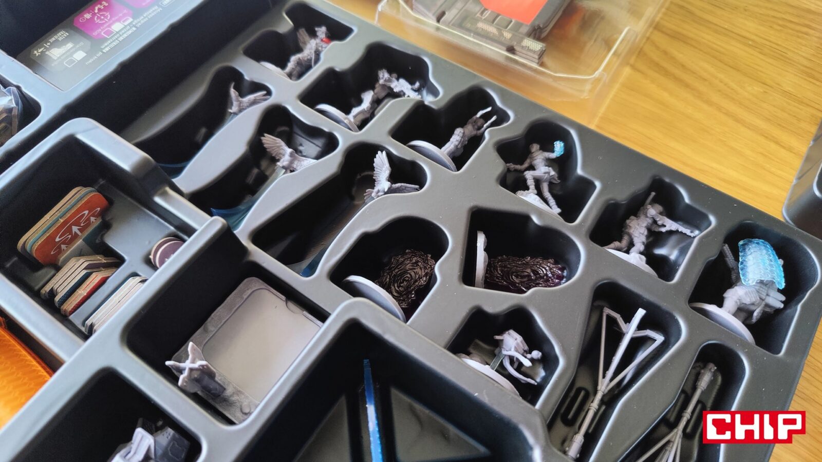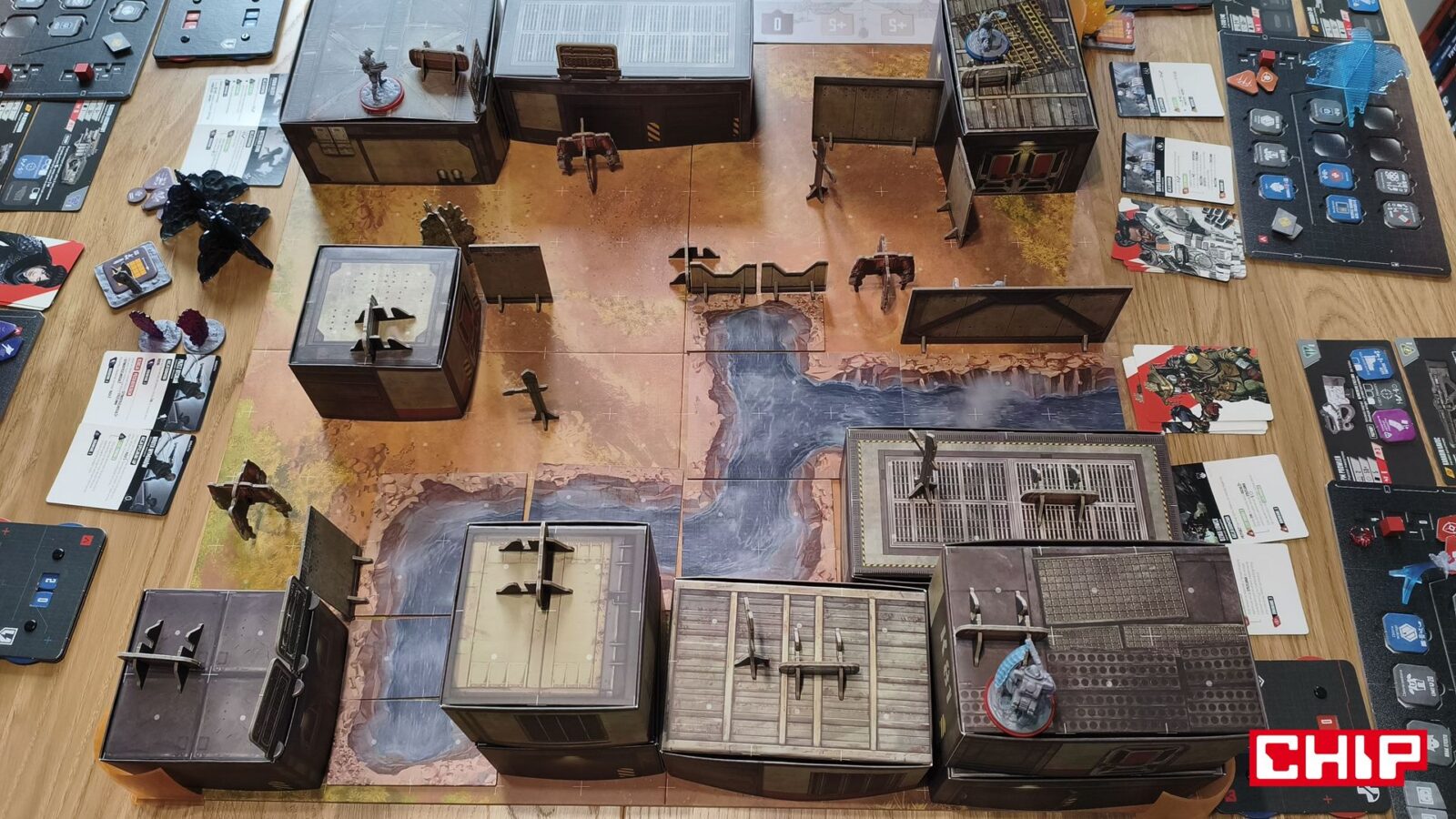 Nie znaczy to jednak, że w trakcie partii wszystko działa idealnie. Apex ma momenty, w których wyraźnie czuć planszówkową “biurokrację”. Rozpatrywanie niektórych akcji, pilnowanie żetonów, operowanie wyposażeniem i czytanie sytuacji na planszy potrafią spowolnić tempo, zwłaszcza gdy przy stole są osoby dopiero uczące się systemu. To trochę paradoks, bo sama gra chce być dynamiczna, agresywna i pełna krótkich zrywów, ale od czasu do czasu wpada w rytm bardziej analityczny niż intuicyjny. Nie wszystkim to będzie przeszkadzać, ale jeśli ktoś liczy na czystą, płynną akcję bez przestojów, to tutaj może się nieco odbić od ściany. Żonglerka zasobami również jest spora, więc obok głównego stołu, warto mieć dodatkową przestrzeń na elementy usunięte z gry, aby nie zawadzały one ciągle przy głównej planszy.