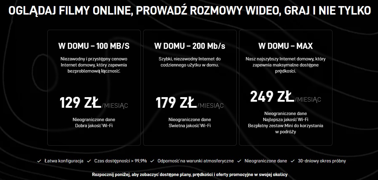 - W domu – 100 Mb/s za 129 zł miesięcznie: To nowa, najtańsza opcja, która zastępuje dawny pakiet Lite (kosztujący 149 zł). Obniżka o 20 zł miesięcznie sprawia, że próg wejścia w świat internetu z orbity stał się wyjątkowo niski. Prędkość 100 Mb/s jest w zupełności wystarczająca do komfortowej pracy zdalnej, oglądania filmów czy nauki online.