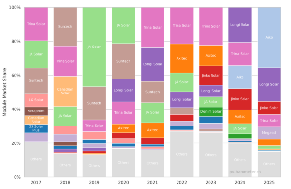 Dane są jednak mocne. Według Photovoltaik Barometer 2026 przygotowanego przez Eturnity i Bern University of Applied Sciences, moduły back-contact (BC) od AIKO i LONGi odpowiadały w 2025 roku za ponad 50% rynku w Szwajcarii. Co więcej, udział producentów BC rósł tam wyraźnie od 2023 do 2025 roku. Jeszcze w 2023 roku AIKO nie było na tym rynku obecne, a LONGi sprzedawało tam głównie moduły TOPCon. Rok później sytuacja zaczęła się zmieniać, a w 2025 roku panele BC przestały być niszą.