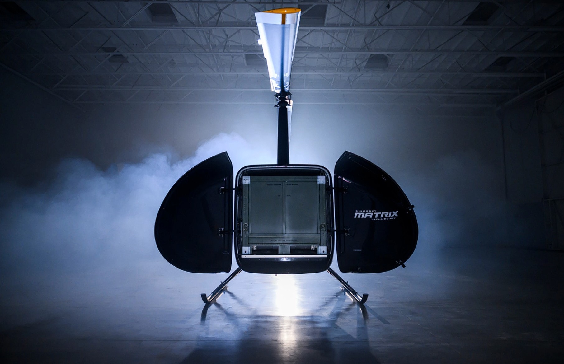 W praktyce taki projekt oznacza przebudowę przedniej części płatowca, który zamiast kabiny dla załogi otrzymał ładownię i otwierane do przodu drzwi typu clamshell, które mają ułatwiać szybki załadunek palety lub zasobników na płaską podłogę ładunkową. Innymi słowy, jest to “mały helikopter, który udaje wojskową ciężarówkę” i nie jest to wcale przypadek.