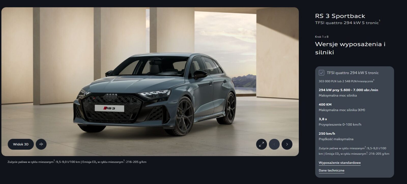 Na papierze obecne Audi RS3 nadal broni się bez najmniejszego problemu. Pod maską ma całe 400 koni mechanicznych, na koła trafia 500 Nm momentu obrotowego, a przyspieszenie od 0 do 100 km/h zajmuje 3,8 sekundy. To auto wciąż pozostaje jednym z najbardziej bezkompromisowych kompaktów w swojej klasie, a przy tym jednym z ostatnich modeli Audi, które korzystają jeszcze z tej unikalnej jednostki. W Polsce RS 3 Sportback startuje obecnie od ponad 300000 zł, więc mówimy o sprzęcie dla wąskiego grona odbiorców, ale jednocześnie o aucie, które wizerunkowo robi dla marki więcej, niż sugerowałaby sama skala sprzedaży.