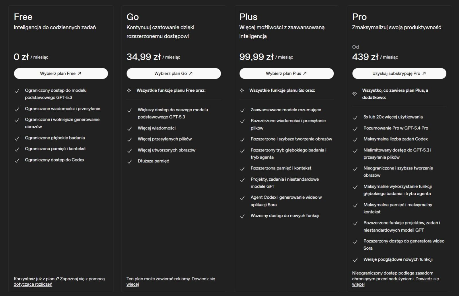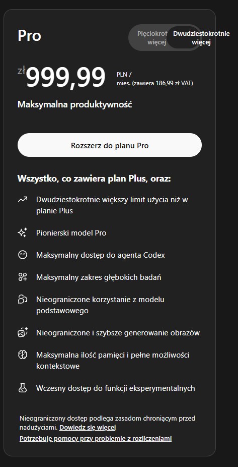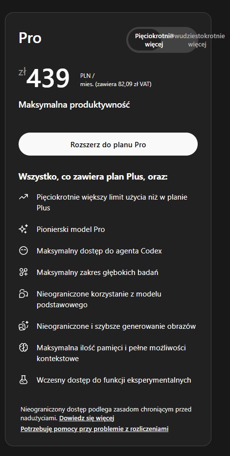 Wprowadzenie nowej taryfy sprawia, że oferta OpenAI staje się bardziej kompletna i przejrzysta. Obecnie użytkownicy mają do wyboru: plan darmowy i tani „Go” (oba z reklamami), klasyczny Plus za 20 dolarów oraz dwie wersje planu Pro – nową za 100 dolarów i dotychczasową za 200 dolarów (u nas to 1000 złotych bez jednego grosza). Choć ta najdroższa opcja zniknęła z głównej strony cennika, firma potwierdziła, że nadal jest dostępna dla najbardziej wymagających użytkowników.