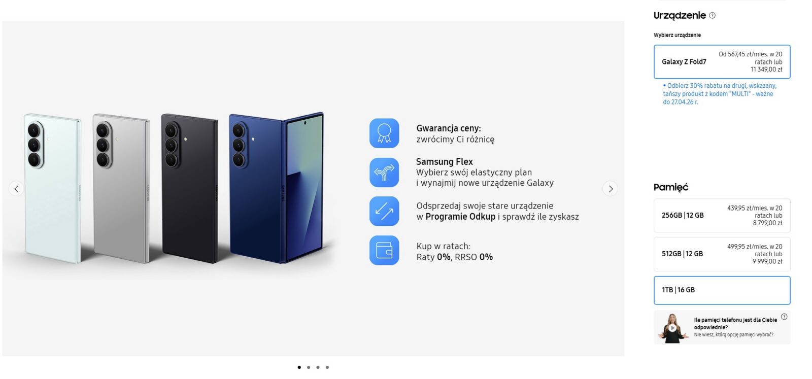 - Galaxy Z Fold 7 (1 TB): debiutował w cenie 10 599 zł. Dziś trzeba za niego zapłacić 11 349 zł (wzrost o 750 zł).