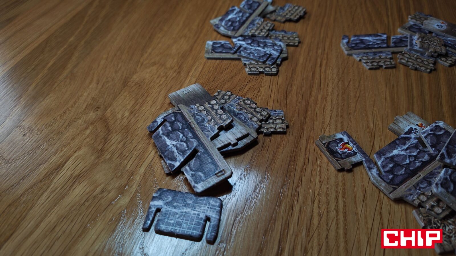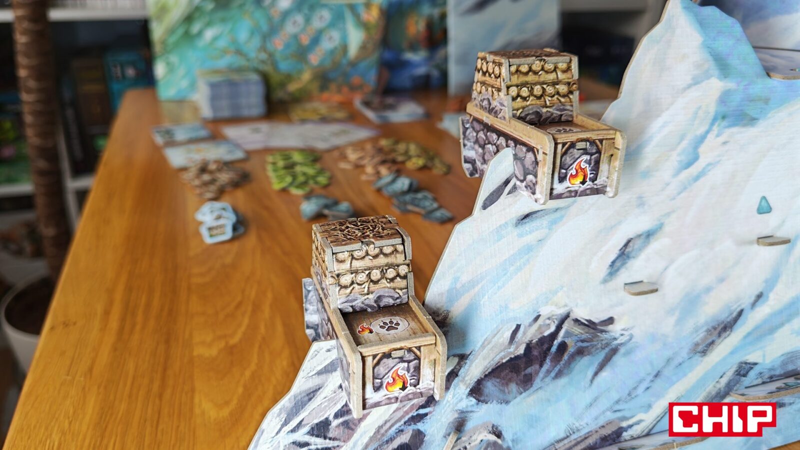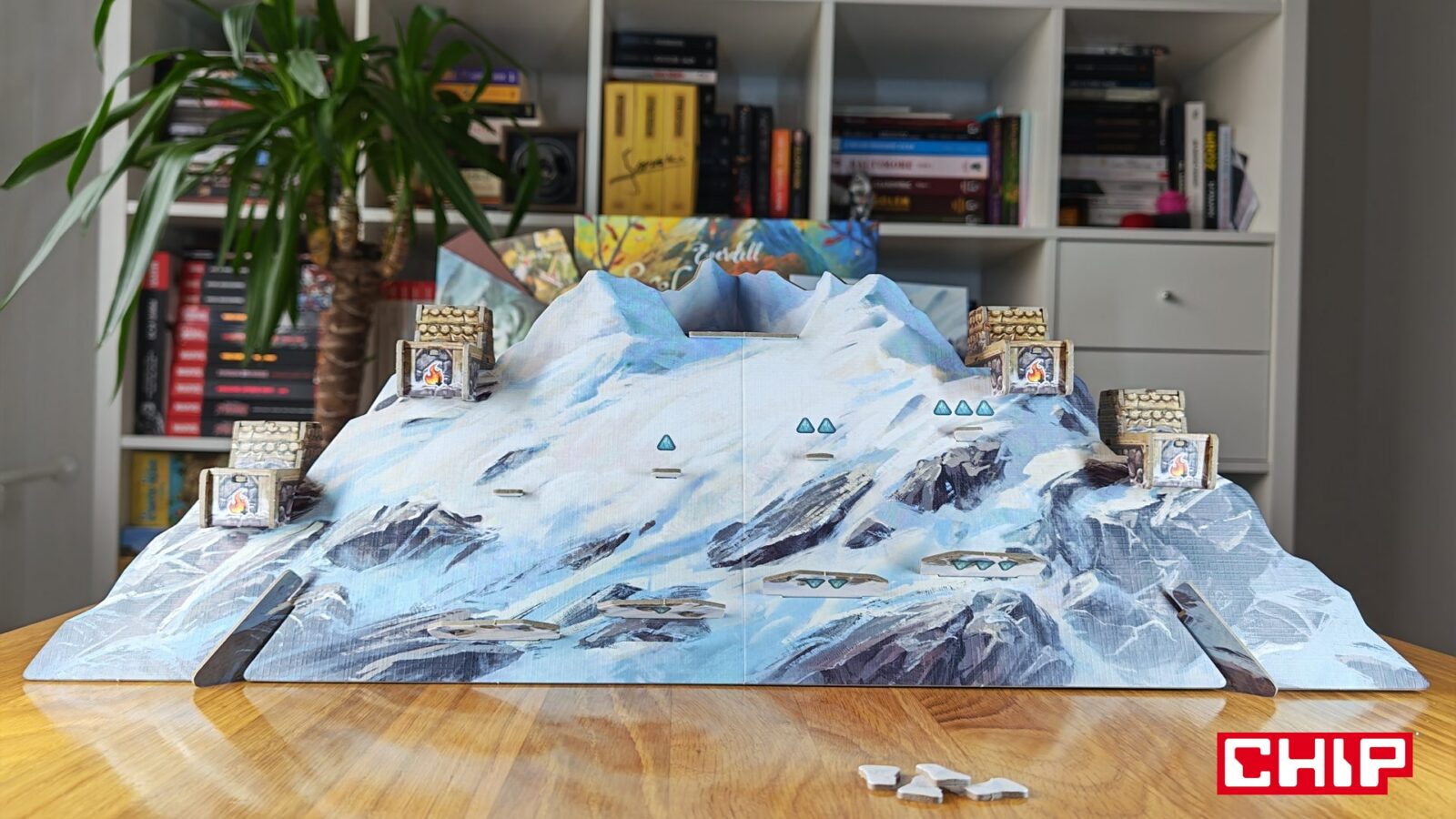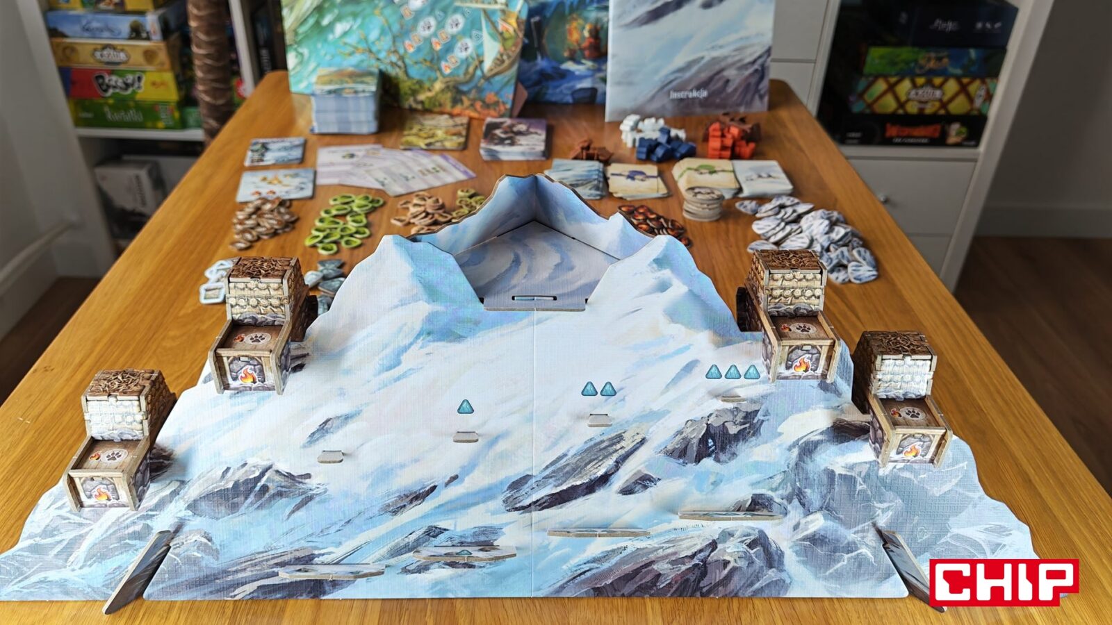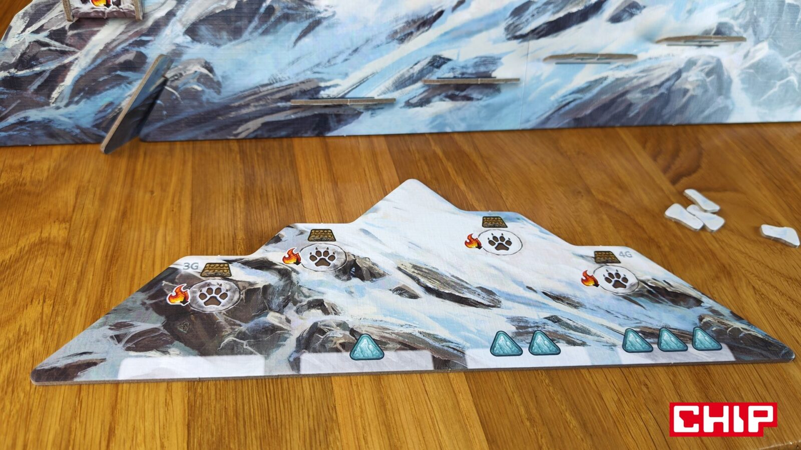 Jednym z najbardziej widowiskowych elementów gry jest tekturowa góra składana z trzech elementów. Jest to typowy dla tej serii element, który ma robić efekt na stole i budować cały klimat. Tego typu dodatki mają jednak zawsze ten sam problem: świetnie wyglądają na zdjęciach, ale trochę gorzej funkcjonują podczas normalnej gry, kiedy miejsca na stole po prostu brakuje brakuje.