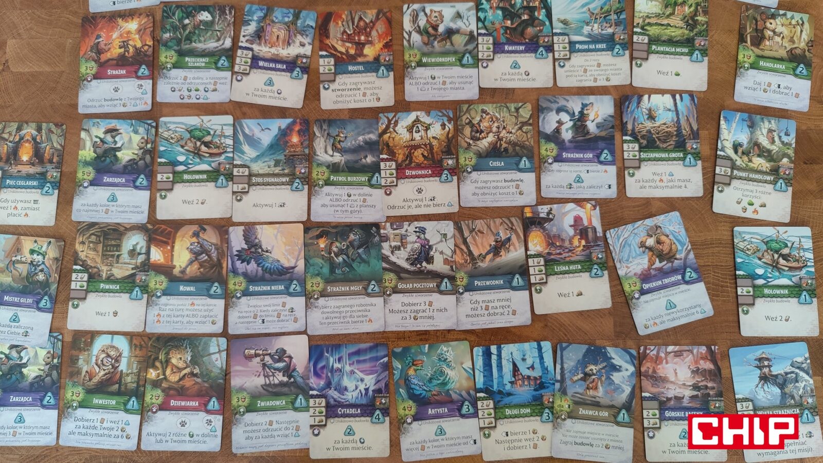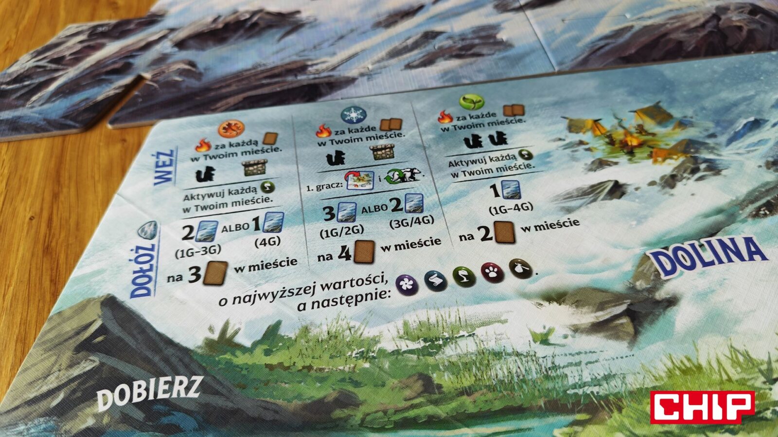 To jest bardzo dobre napięcie, bo śnieg nie działa w tej grze jak losowy modyfikator wrzucony tylko po to, żeby przeszkadzać. Wpisuje się on bezpośrednio ekonomię gry. Czasami odśnieżasz, bo musisz. Czasami dlatego, że karta pod śniegiem da punkty. Czasami dlatego, że potrzebujesz konkretnego efektu, a czasami dlatego, że odśnieżanie poza własnym miastem daje korzyści punktowe lub taktyczne. Bardzo podoba mi się tu zresztą, że nie ograniczamy się tu wyłącznie do własnego obszaru. Możemy odśnieżać dolinę, a nawet miasto innego gracza, więc z pozornie defensywnej czynności powstaje narzędzie do kombinowania.