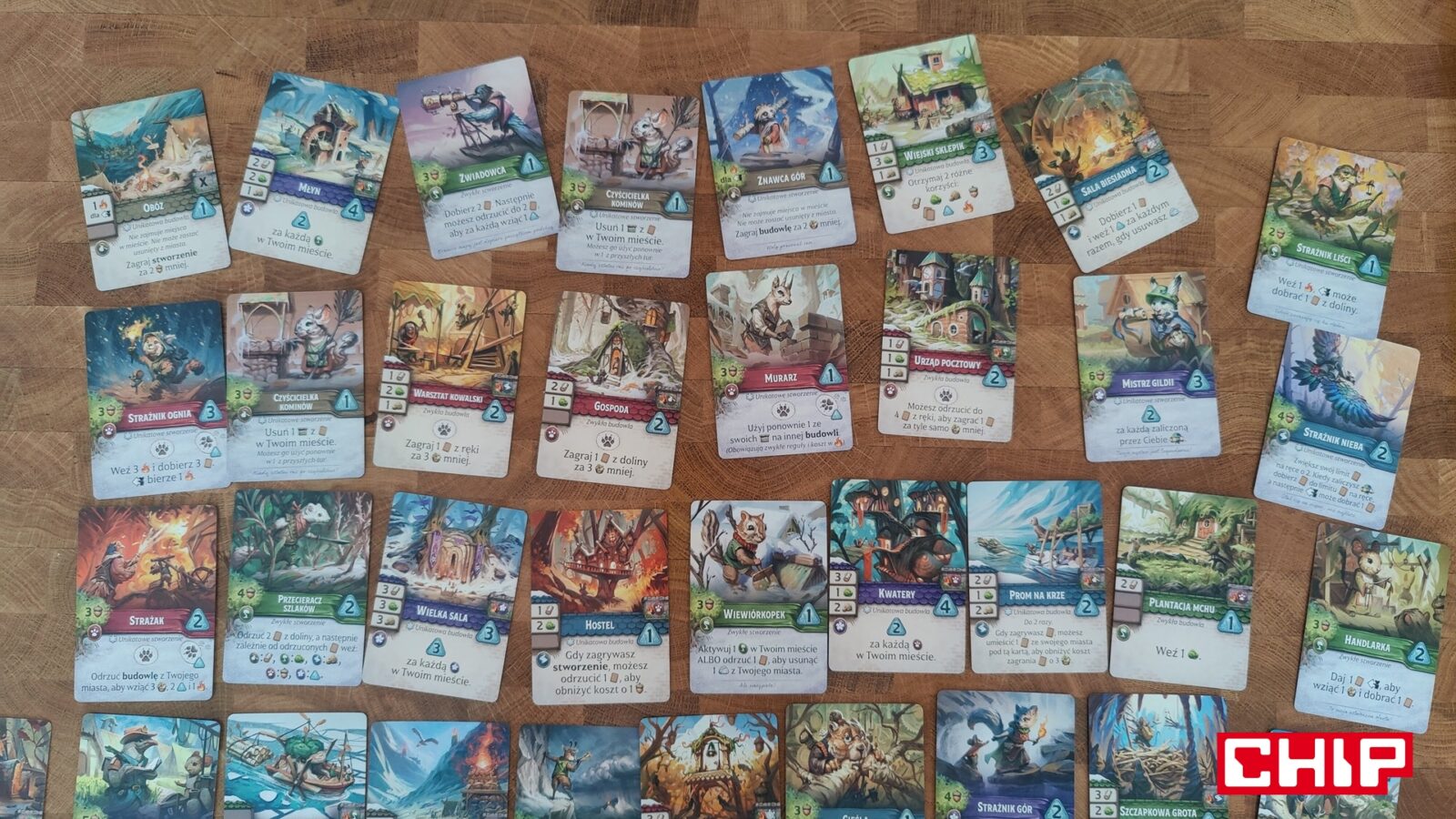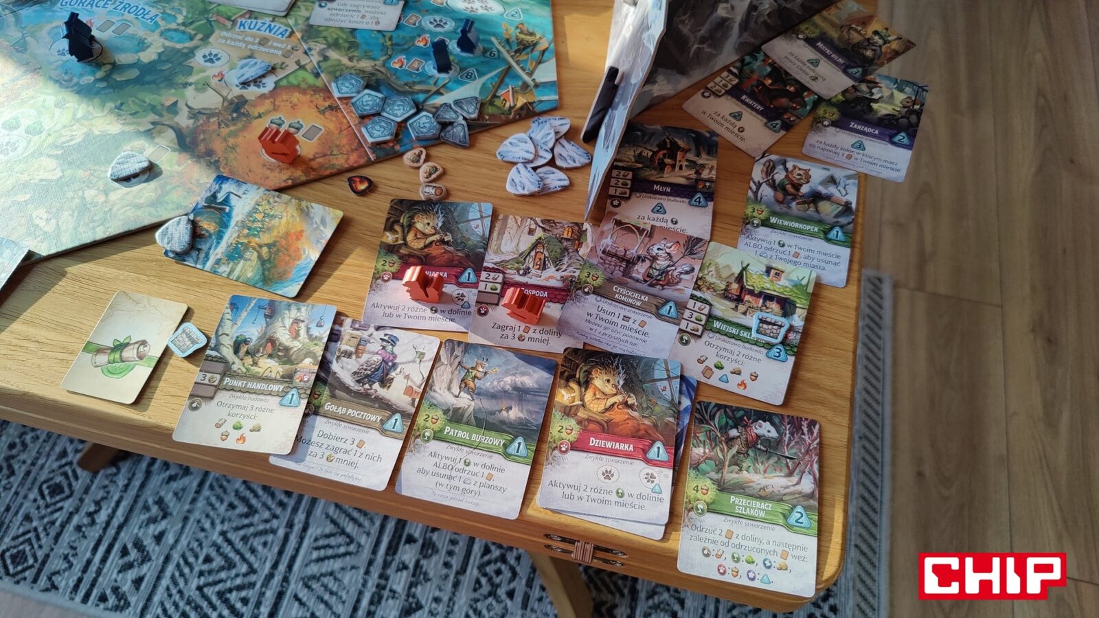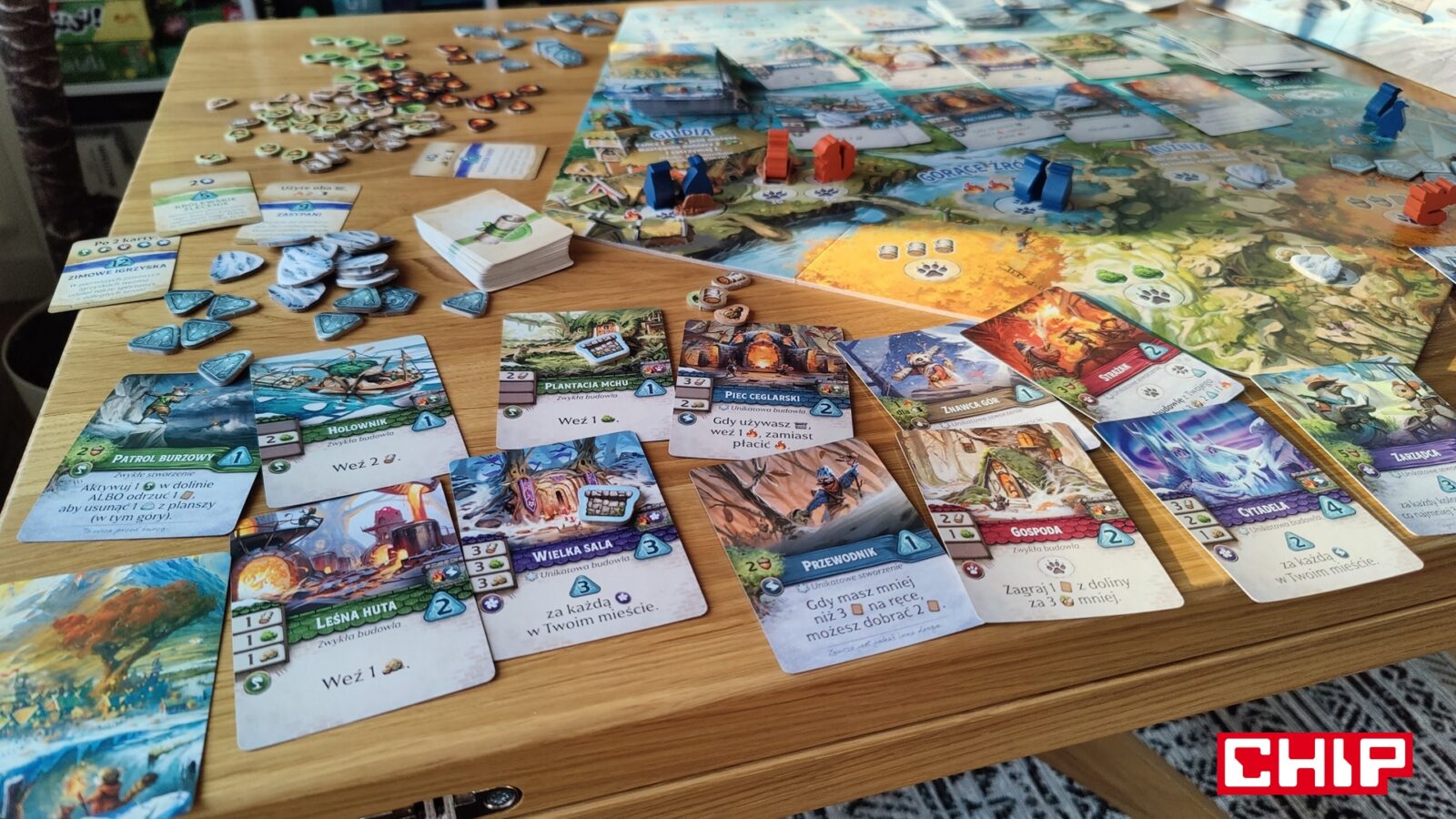 Największym rozczarowaniem jest z kolei jakość części komponentów. Tekturowe surowce w grze tej klasy zwyczajnie nie dają takiej przyjemności, jakiej można byłoby oczekiwać po Everdellu. Do tego dochodzi wypraska, która działa, ale sprawia wrażenie przygotowanej pod droższą wersję z lepszymi elementami. Srebrnoszrony nadal wyglądają dobrze na stole, lecz czuć, że fizyczne wydanie mogłoby lepiej wspierać ambicje tej gry.