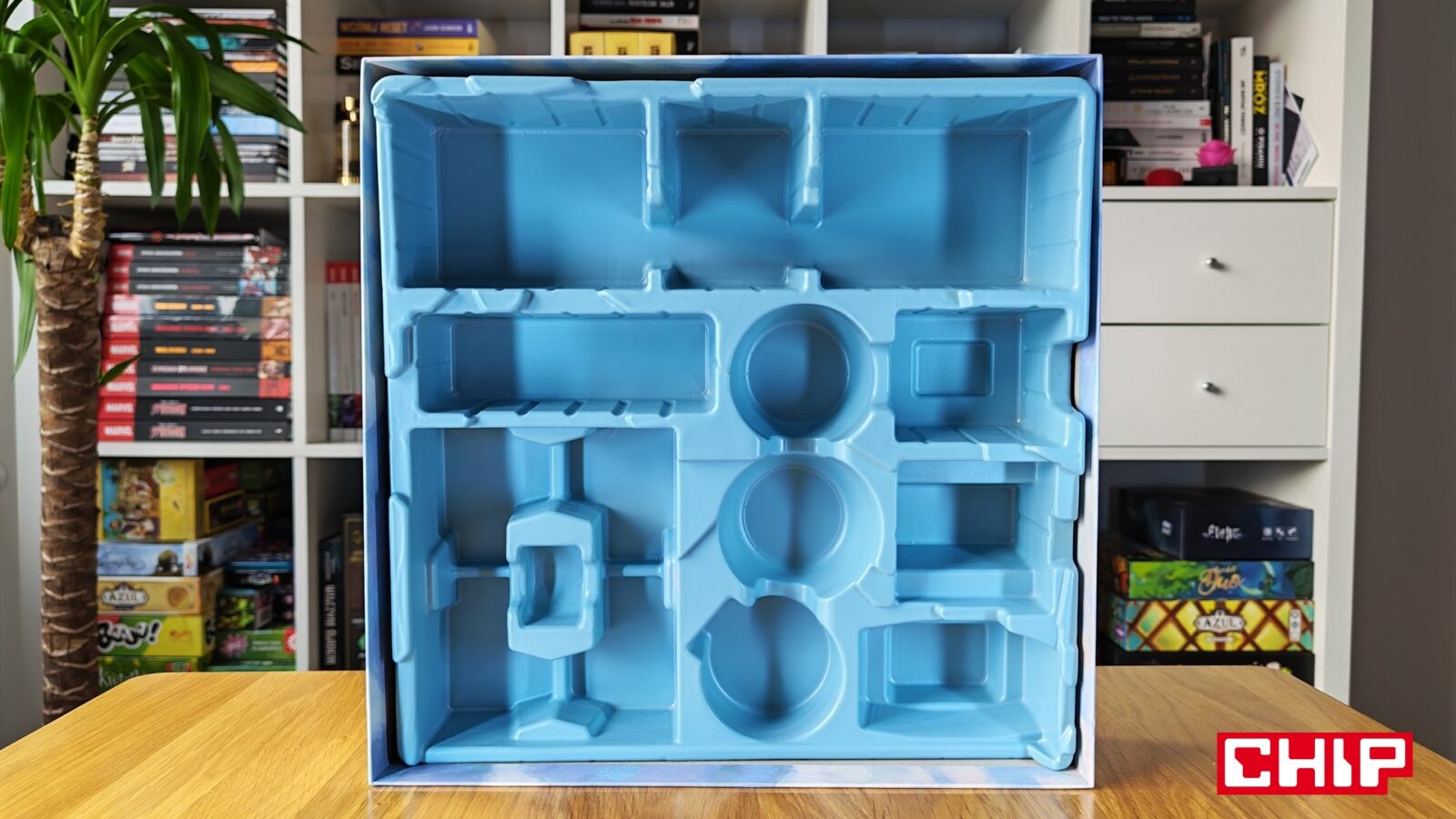 Drugi problem dotyczy wypraski. Sama wkładka jest użyteczna i większość elementów da się do niej ułożyć intuicyjnie, ale brakuje jasnego wytłumaczenia, co dokładnie powinno trafić w które miejsce. Po chwili można dojść do sensownego układu samodzielnie, lecz widać, że wypraska została zaprojektowana z myślą o bogatszej wersji gry i lepszych komponentach. W podstawowym wydaniu zostaje po tym trochę dziwne wrażenie, jakby pudełko było przygotowane pod coś bardziej luksusowego, a później część zawartości została sprowadzona do skromniejszego poziomu.