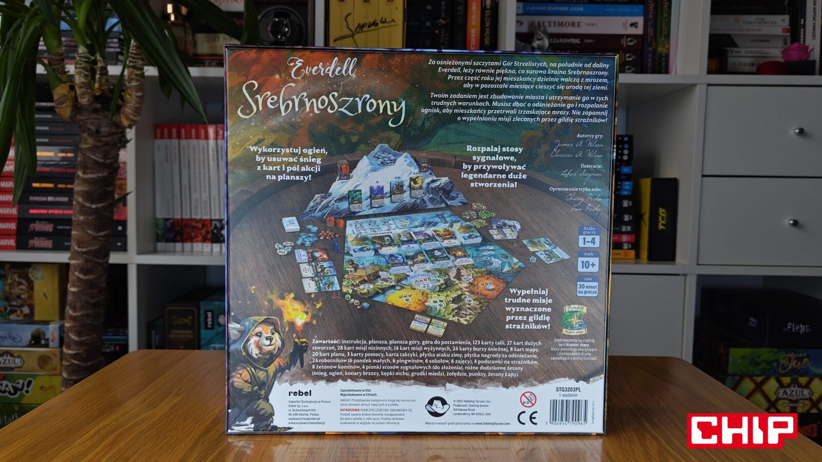 Na stole Everdell: Srebrnoszrony wygląda bardzo dobrze. Zimowa oprawa pasuje do serii, ilustracje mają ten sam baśniowy charakter, a całość od razu sugeruje, że nie mamy do czynienia z suchą układanką punktową. Wizualnie jest to nadal planszówka, która chce budować nastrój unikalnym stylem. Problem w tym, że po otwarciu pudełka entuzjazm trochę stygnie, bo jakość części elementów nie wszędzie idzie za ceną i rozmachem gry.