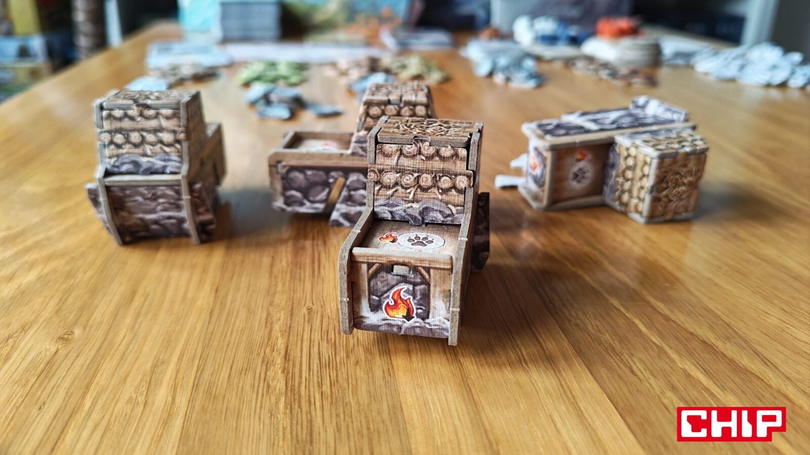 Najbardziej boli mnie downgrade surowców. Zamiast fajnych, przyjemnych w dotyku komponentów dostajemy w części przypadków tekturowe żetony. Oczywiście da się z tym grać i oczywiście nie psuje to mechaniki, ale w serii, która przez lata budowała swoją pozycję także na fizycznej przyjemności obcowania z elementami, takie cięcie jest wyraźnie odczuwalne. Everdell zawsze miał w sobie coś z planszówkowej dekoracyjności i tutaj też ją ma, ale niektóre elementy bardziej przypominają wersję ekonomiczną niż pełnoprawne, dopieszczone wydanie.