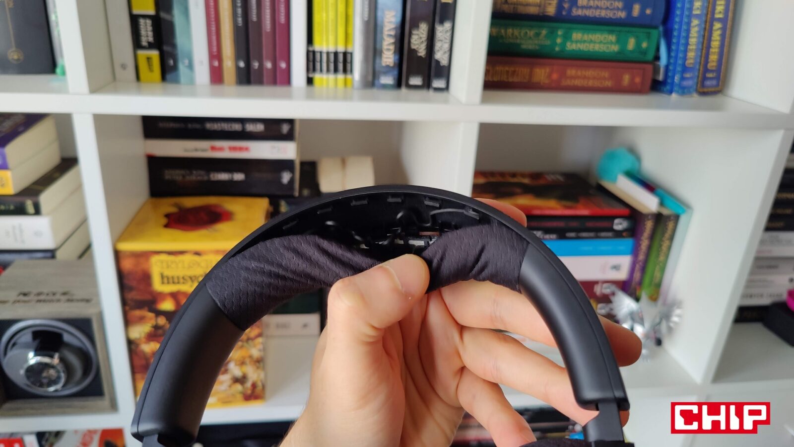 Przy takich “wygibasach” odkryłem też, że obicie pałąku od spodu nie jest najlepiej przytwierdzone do całej struktury i po rozłożeniu muszli zbytnio na boki, może pokazać zbyt wiele, niż chciałby tego producent. Spokojnie jednak – wystarczy wcisnąć tę piankową-materiałowy duet na swoje miejsce, aby “naprawić” taki defekt, który (na szczęście) przy typowym korzystaniu ze słuchawek nigdy się nie pojawi. Szkoda akurat, że Glorious nie zrobiło z tego funkcji, bo w dzisiejszych czasach każdy sprzęt aż prosi się o opcję wymiany zużywających się elementów, takich jak nauszniki oraz pałąk właśnie.