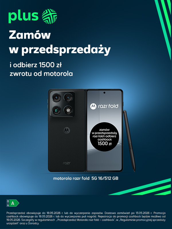 - Motorola razr fold 5G (16/512GB) kosztuje obecnie 9999 zł w ofercie na 12 rat. Przy zakupie Motoroli można zgarnąć aż 1500 zł cashbacku, o ile zamówimy sprzęt do 18 maja 2026 roku i zarejestrujemy zakup. Więcej na ten temat znajdziecie tutaj.