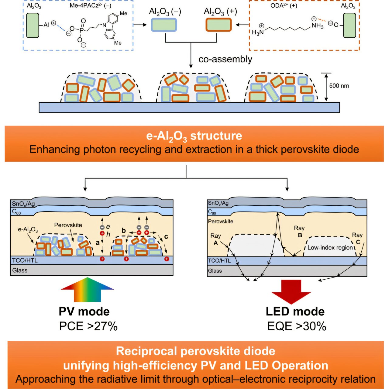 W badaniu opublikowanym w “Joule” naukowcy pochwalili się perowskitową diodą, która działa zarówno jak ogniwo słoneczne, jak i panel LED. W trybie fotowoltaicznym osiągnęła certyfikowaną, stabilizowaną sprawność konwersji energii na poziomie 26,7%, a w trybie emisyjnym uzyskała około 31% zewnętrznej sprawności kwantowej. W dużym uproszczeniu oznacza to, że 31 na 100 wstrzykniętych elektronów kończyło jako foton wydostający się z urządzenia.
