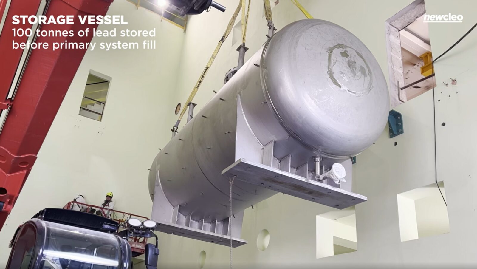 Obecny etap prac dotyczy trzech głównych elementów systemu obsługi ołowiu. Pierwszy to zbiornik topienia, do którego trafiają wlewki ołowiu i gdzie materiał przechodzi w stan ciekły. Drugi to zbiornik magazynowy, odpowiadający za przechowywanie stopionego ołowiu i utrzymywanie jego odpowiednich parametrów chemicznych podczas pierwszego napełnienia lub przerw serwisowych. Trzeci element to zbiornik transferowy, który ma przenosić ciekły ołów między magazynem a głównym naczyniem instalacji. Cały projekt nie sprowadza się więc do “pomysłu na reaktor”, tylko do bardzo konkretnej inżynierii ciężkiego, gorącego i trudnego w obsłudze metalu.