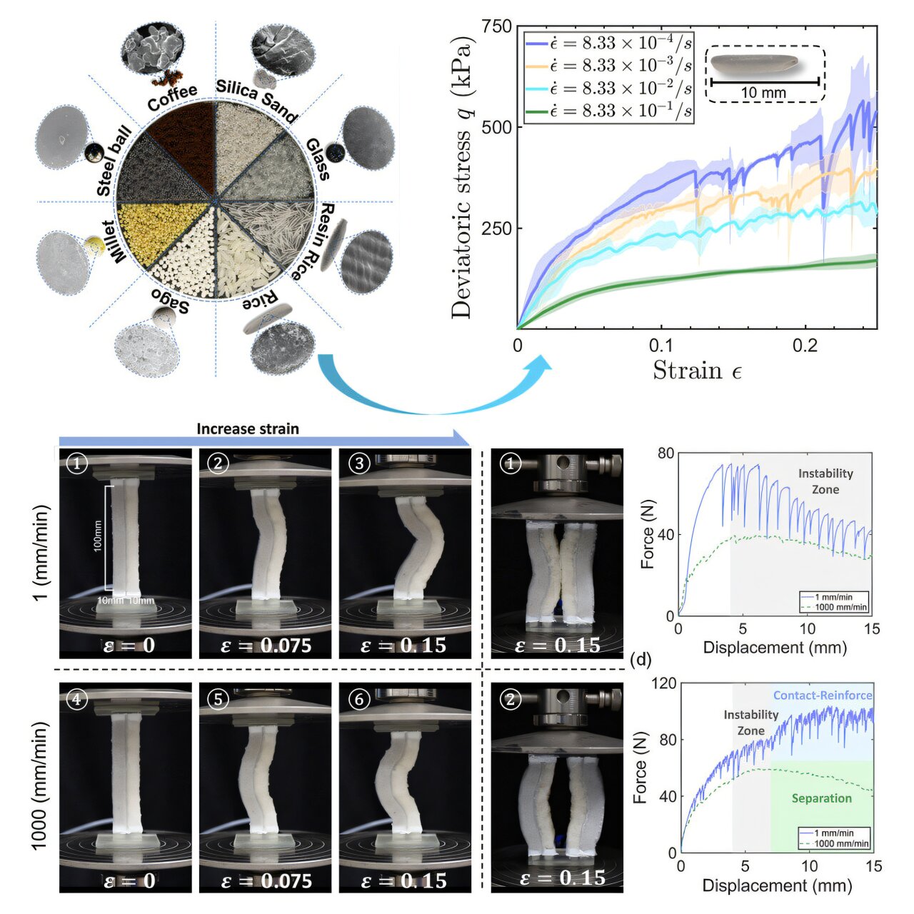 Naukowcy odkryli, iż ziarna ryżu wykazują niezwykle rzadką i zaskakującą właściwość mechaniczną. W przeciwieństwie do większości znanych materiałów, które stają się bardziej odporne przy szybkich obciążeniach, ryż zachowuje się odwrotnie. Pod wpływem powolnego nacisku pozostaje stosunkowo sztywny i wytrzymały, natomiast gdy siła działa szybko – nagle słabnie i traci swoją strukturę nośną.