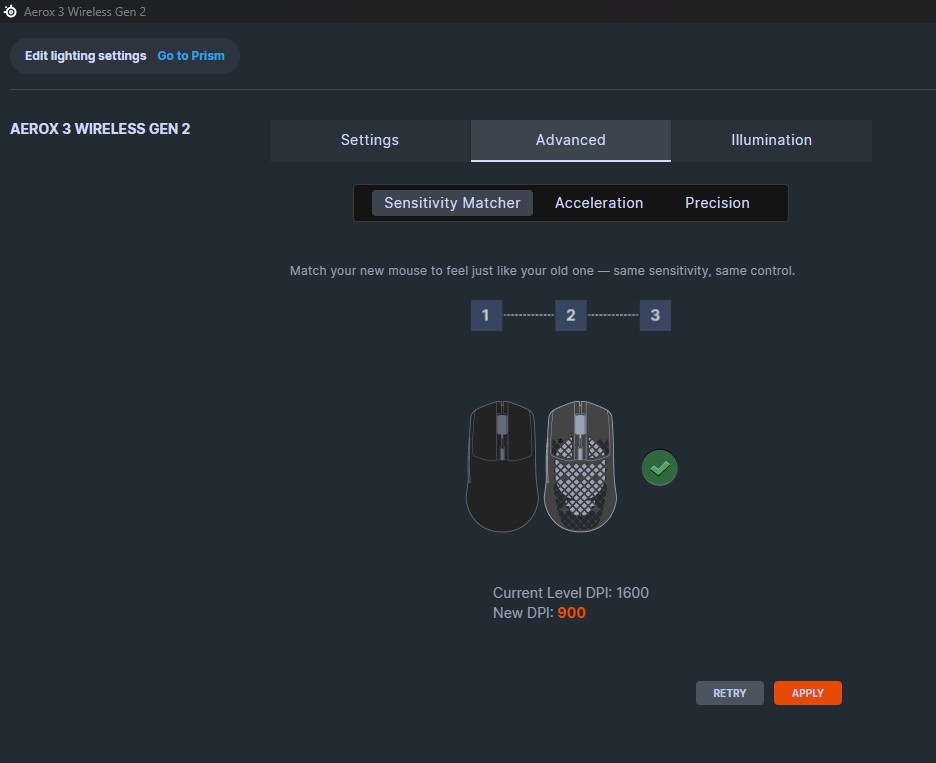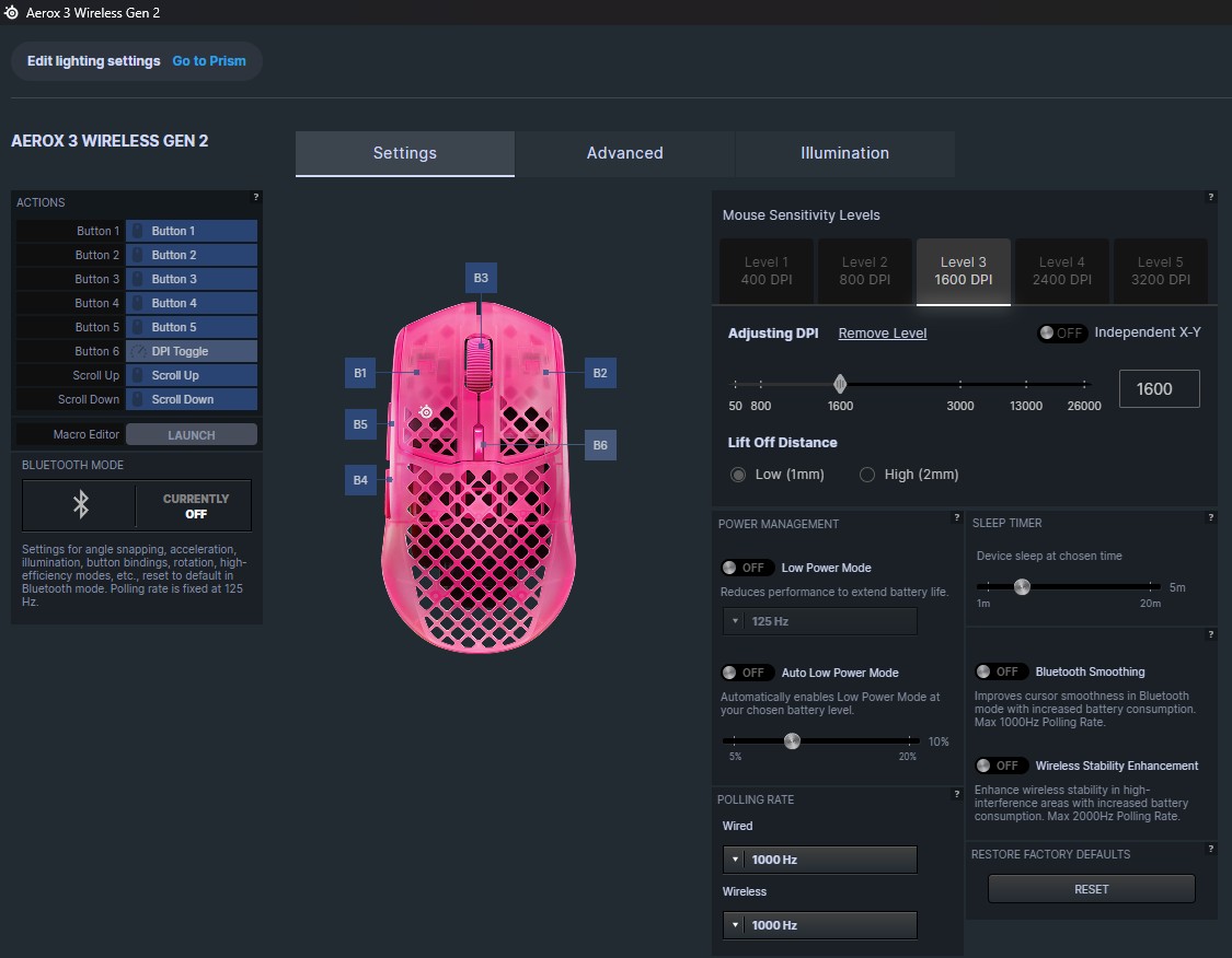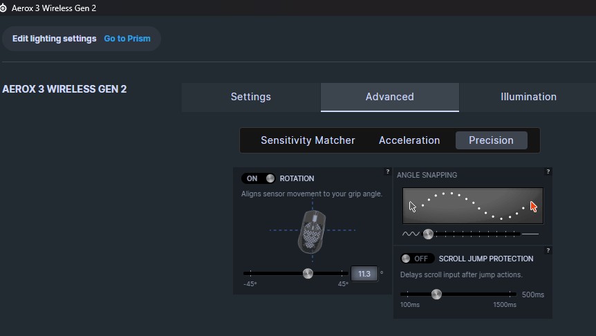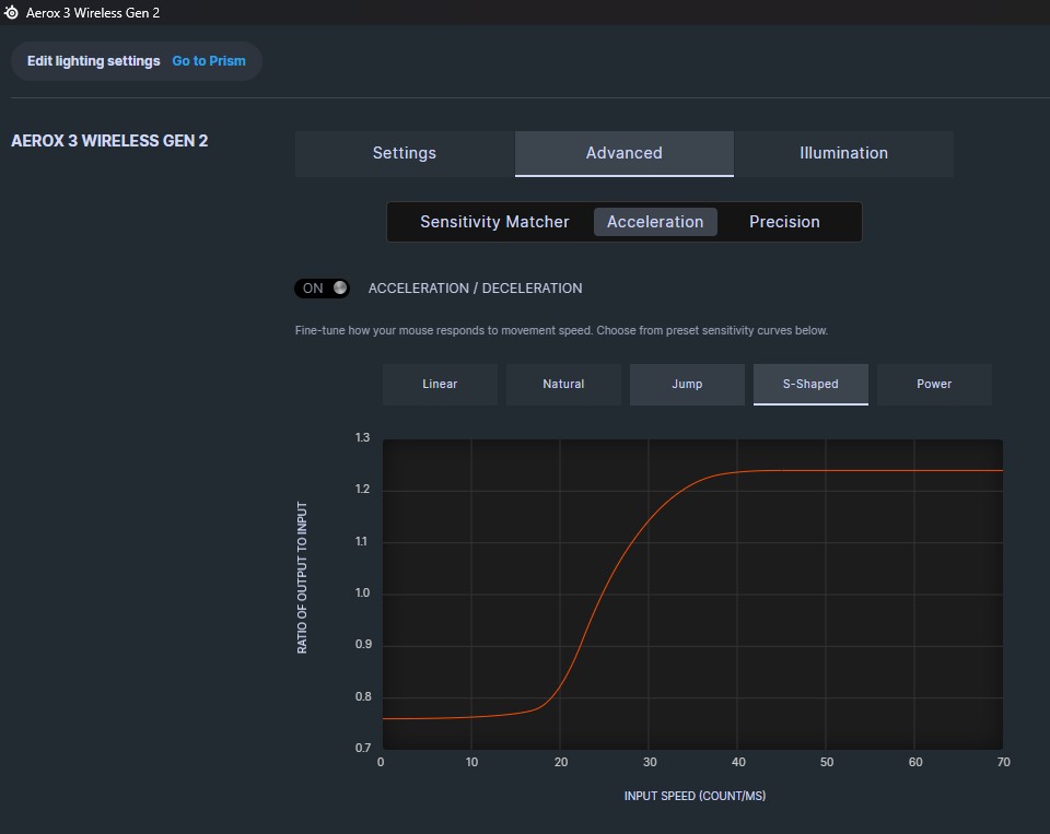 Jak na odświeżenie tego typu przystało, producent musiał podciągnąć stosownie funkcjonalność po stronie oprogramowania SteelSeries GG. Naturalnie nadal mamy dostęp do zarówno podstawowych, jak i bardziej zaawansowanych ustawień, które wędrują do pamięci myszki. No, przynajmniej większa część z nich, bo wszystko to, co ustawicie w zakładce Prism (podświetlenia), nie jest synchronizowane z pamięcią myszki. Jest to akurat ewidentnie niedopatrzenie ze strony producenta, które staje się problemem, kiedy z myszki korzystacie nie tylko na “głównym” komputerze z zainstalowaną aplikacją albo po prostu nie chcecie mieć aplikacji aktywnej w tle. Na szczęście wyłączenie podświetlenia w zakładce ustawień myszki (tak, to inna zakładka) załatwia tę sprawę.
